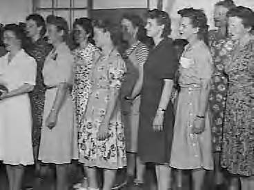 Eerste groep van recruten van het Vrouwenkorps van het KNIL ontvangen hun militaire kleding op het WAC trainingscentrum in Fort Oglethore, Georgia. Vlnr. soldaat Helen Murphy (foerier), Francisca Schwaner, Margaretha Bakker, Wendelina Ruardi Wichers, Gerarda van Moorsel-Landzaat, Sonja Boekman, Ella Hassel, Wendela Kiewiet de Jonge, Hilda ter Braake, Catherina Dencher-Joseph en Helena Heymans