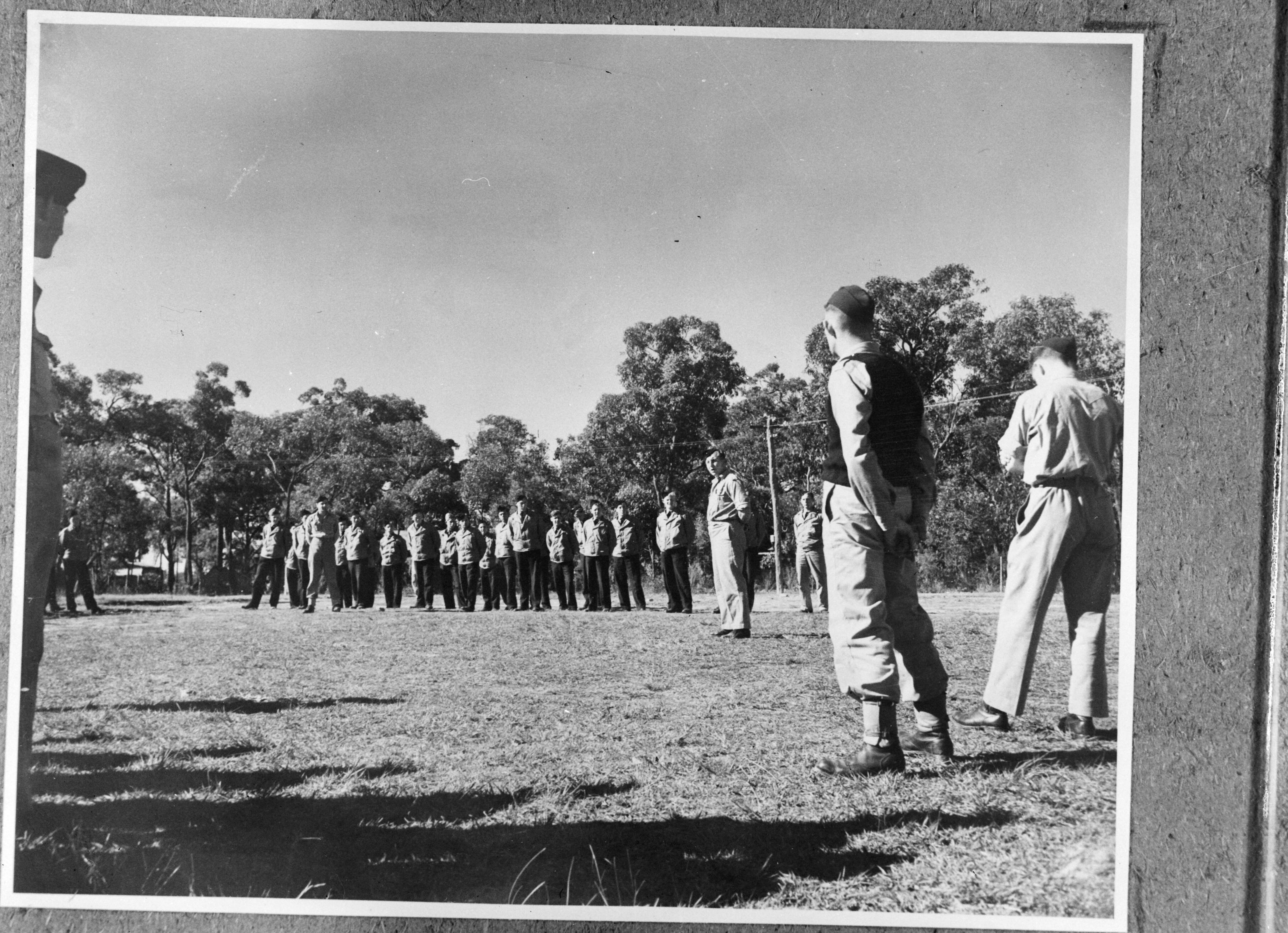 Recruten van ML-KNIL (Militaire Luchtvaart Koninklijk Nederlands Indisch Leger) in training op Camp St. Ives Bradfield Park bij Sydney (New South Wales). Eerste parade en openingstoespraak door W/O Windon voor een groep die geleid en geinstueerd wordt door segeant Golding uit Sydney