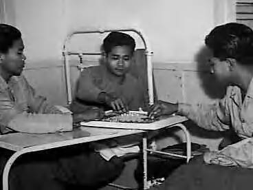 Nederlandse recruten van het KNIL uit Europa in training op Camp Darley, Victoria (Australië). De soldaten Dardjan, Toemidjo en Miswan tijdens een spelletje