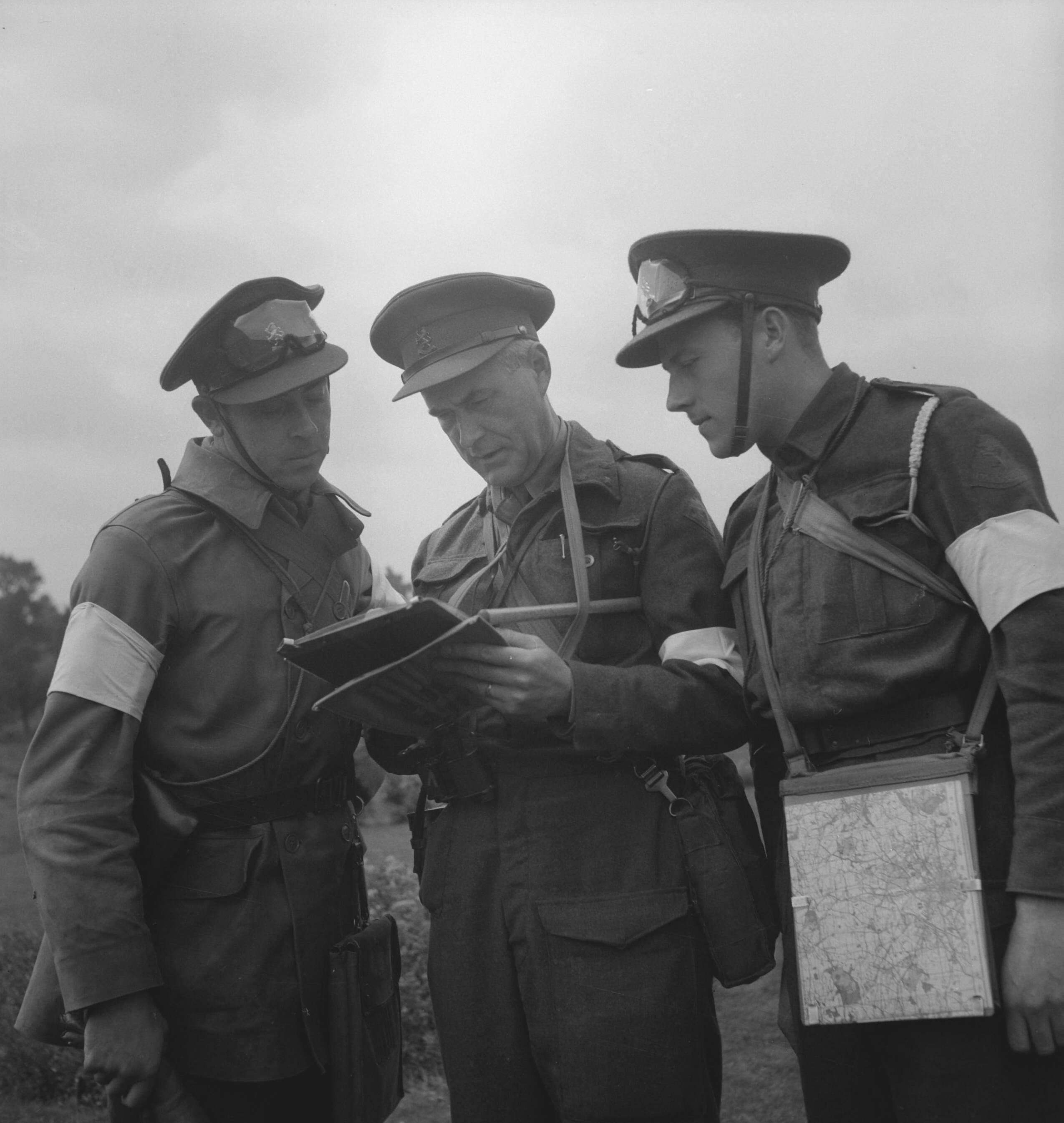 De Amerikaanse ambassadeur bij de geallieerde regeringen, Drexel Biddle, bezoekt het kamp van de Prinses Irene Brigade in gezelschap van de Nederlandse minister-president, de minister van Oorlog en andere Nederlandse ministers. Gedurende de manoeuvres. Koeriers ontvangen hun instructies.