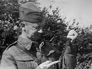 Serie Nederlandse militairen in kamp in Engeland. geen beschrijvingen bij foto's. Luitenant test scherpte van bajonet