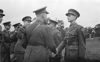 Prinses Irene Brigade brigadecommandant De Ruyter van Steveninck en inspecteur-generaal Phaff lopen langs opgestelde motorordonnansen