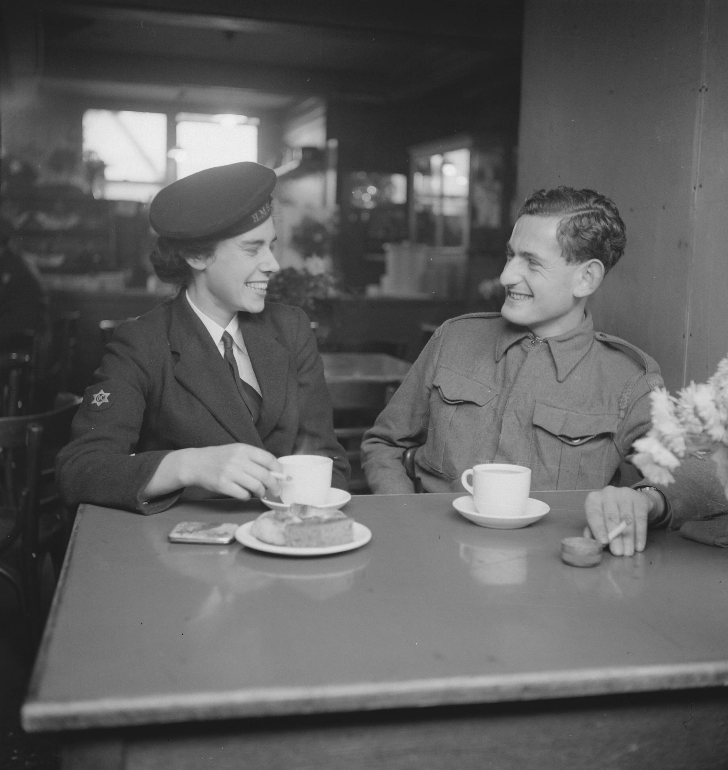 Nederlandse soldaten in training. Prinses Irene Brigade. Bijschrift "We don't know what the joke is all about, but this Wren with a Dutch soldier seems to think it pretty good"