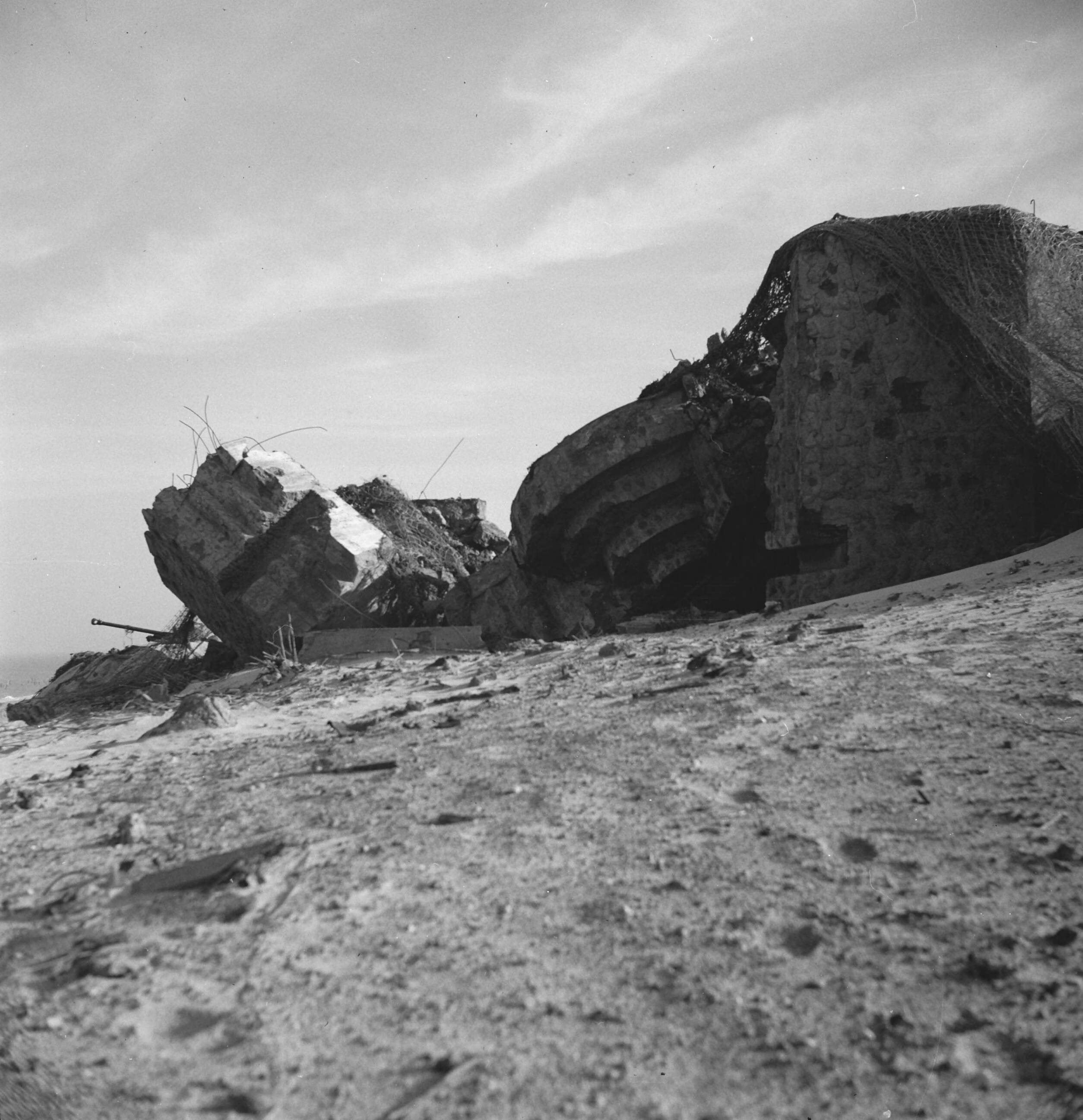 Prinses Irene Brigade in Nederland. Een verwoeste Duitse bunker van de Atlantikwall in de duinen