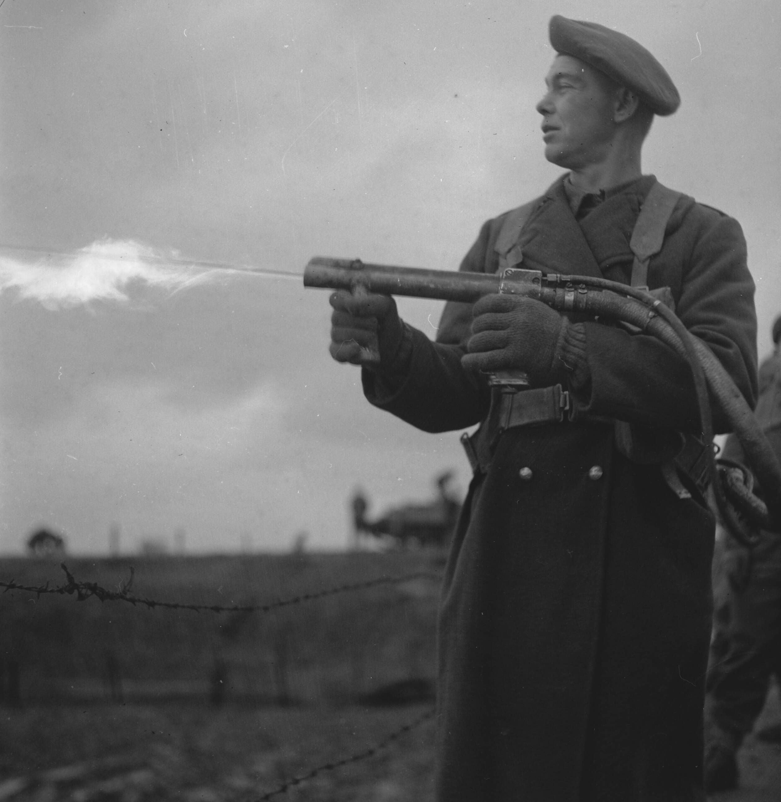 Koninkijke Nederlandse Prinses Irene Brigade neemt deel aan de bevrijding van Nederland. Militair met nieuw wapen (vlammenwerper)