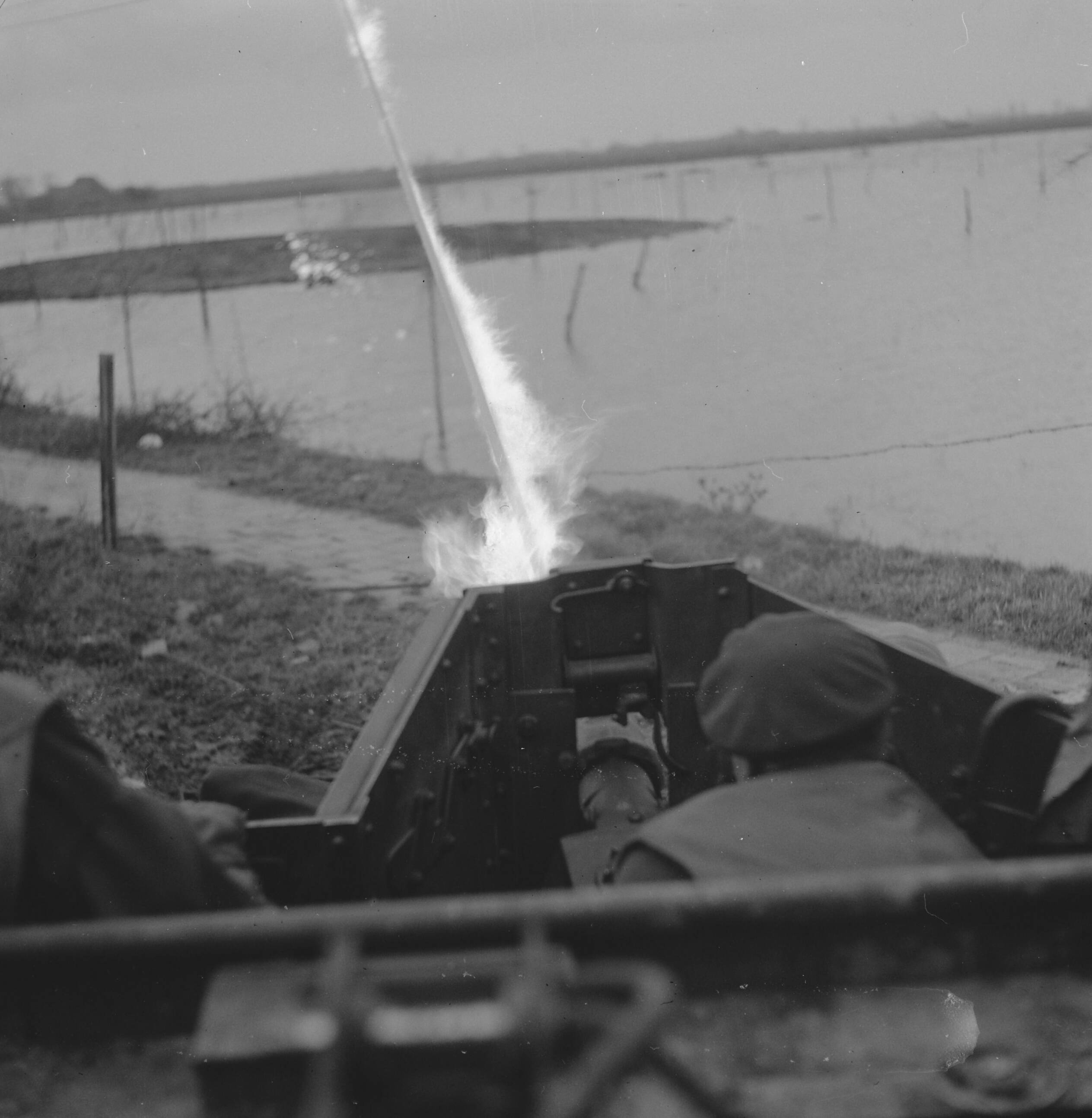 Koninkijke Nederlandse Prinses Irene Brigade neemt deel aan de bevrijding van Nederland. Nieuw wapen (vlammenwerper)