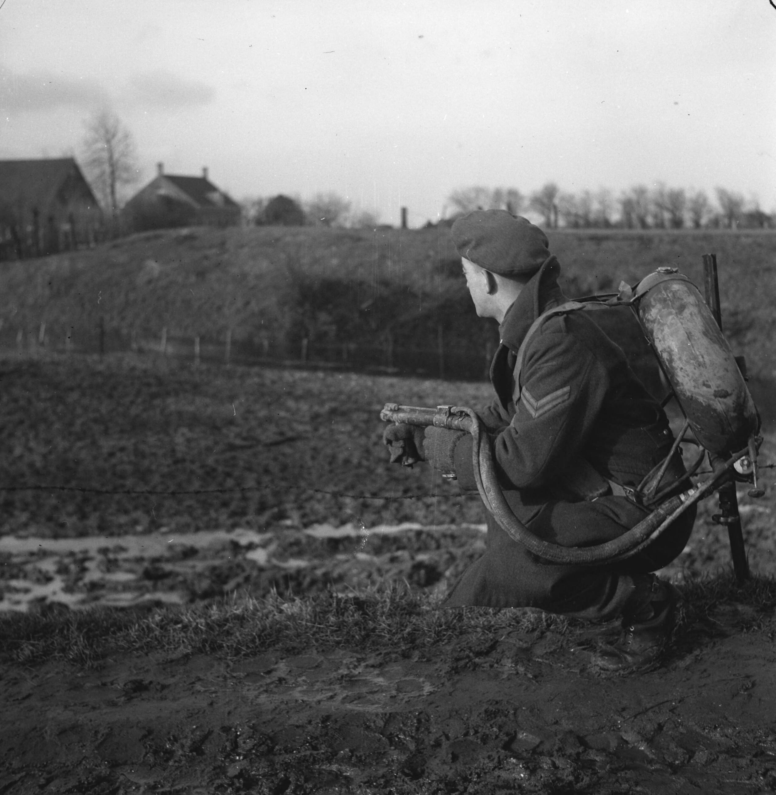 Koninkijke Nederlandse Prinses Irene Brigade neemt deel aan de bevrijding van Nederland. Nieuw wapen (vlammenwerper)