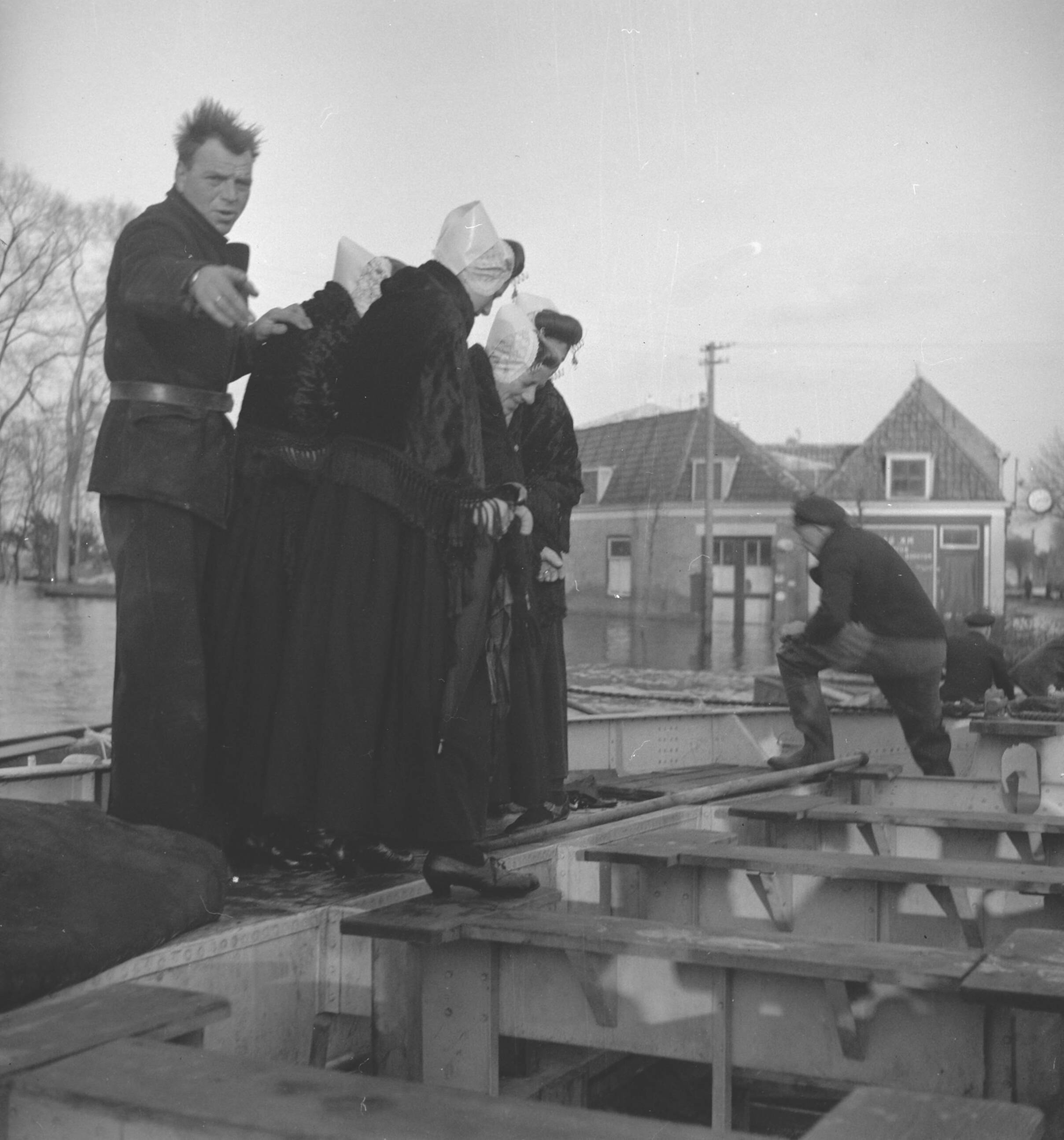 Inundaties in Zeeland Vluchtelingen in Zeeuwse klederdracht stappen in een boot
