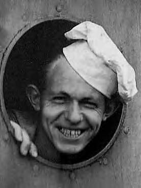 Serie bezoek van prins Bernhard aan de pas opgeleverde torpedobootjager Hr. Ms. "Tjerk Hiddes" (vm HMS Nonpareil). Scheepskok kijkt door de kombuispoort