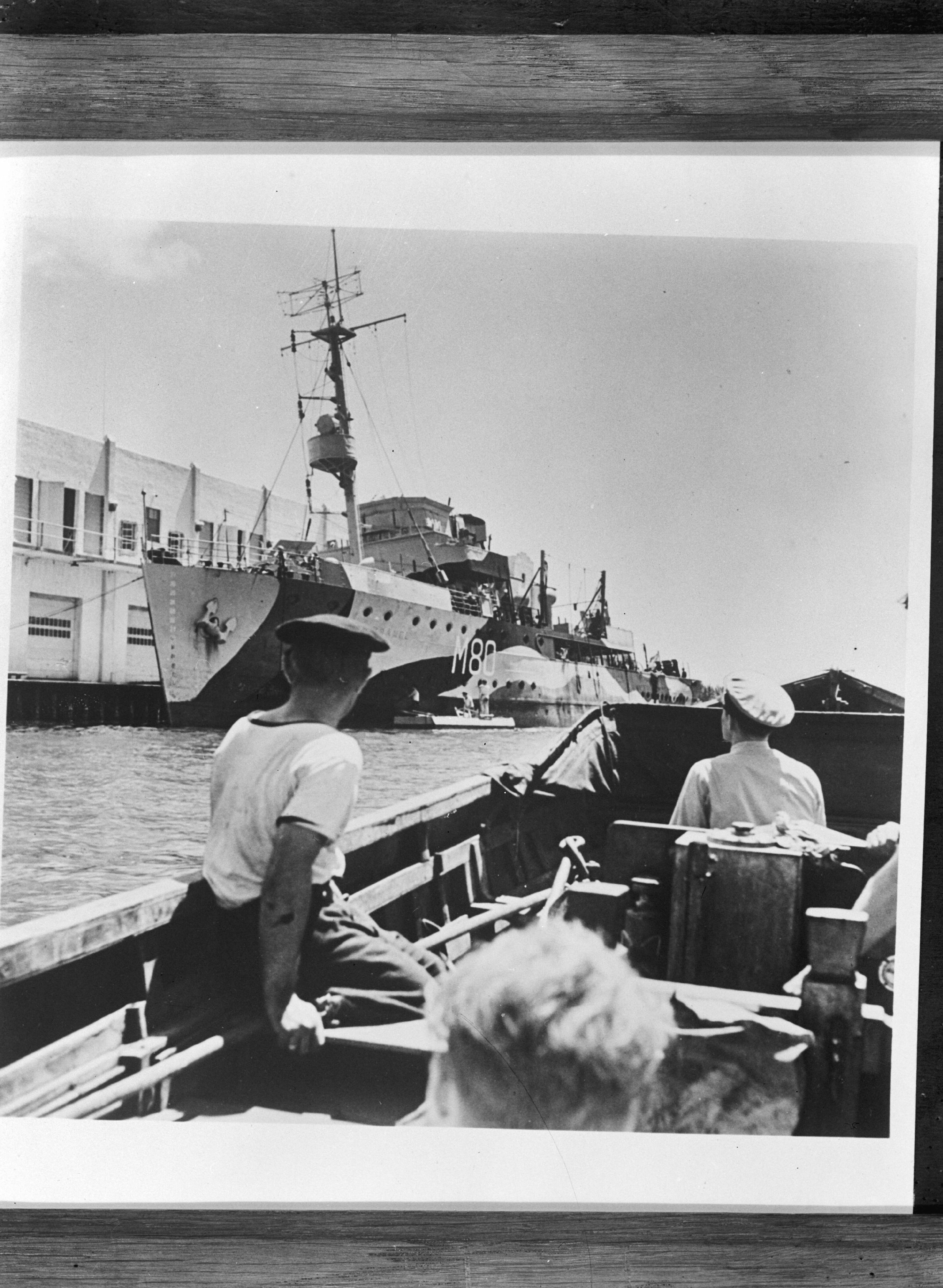 Hr. Ms. Jan van Brakel in Amerikaanse haven. Matrozen naderen met sloep