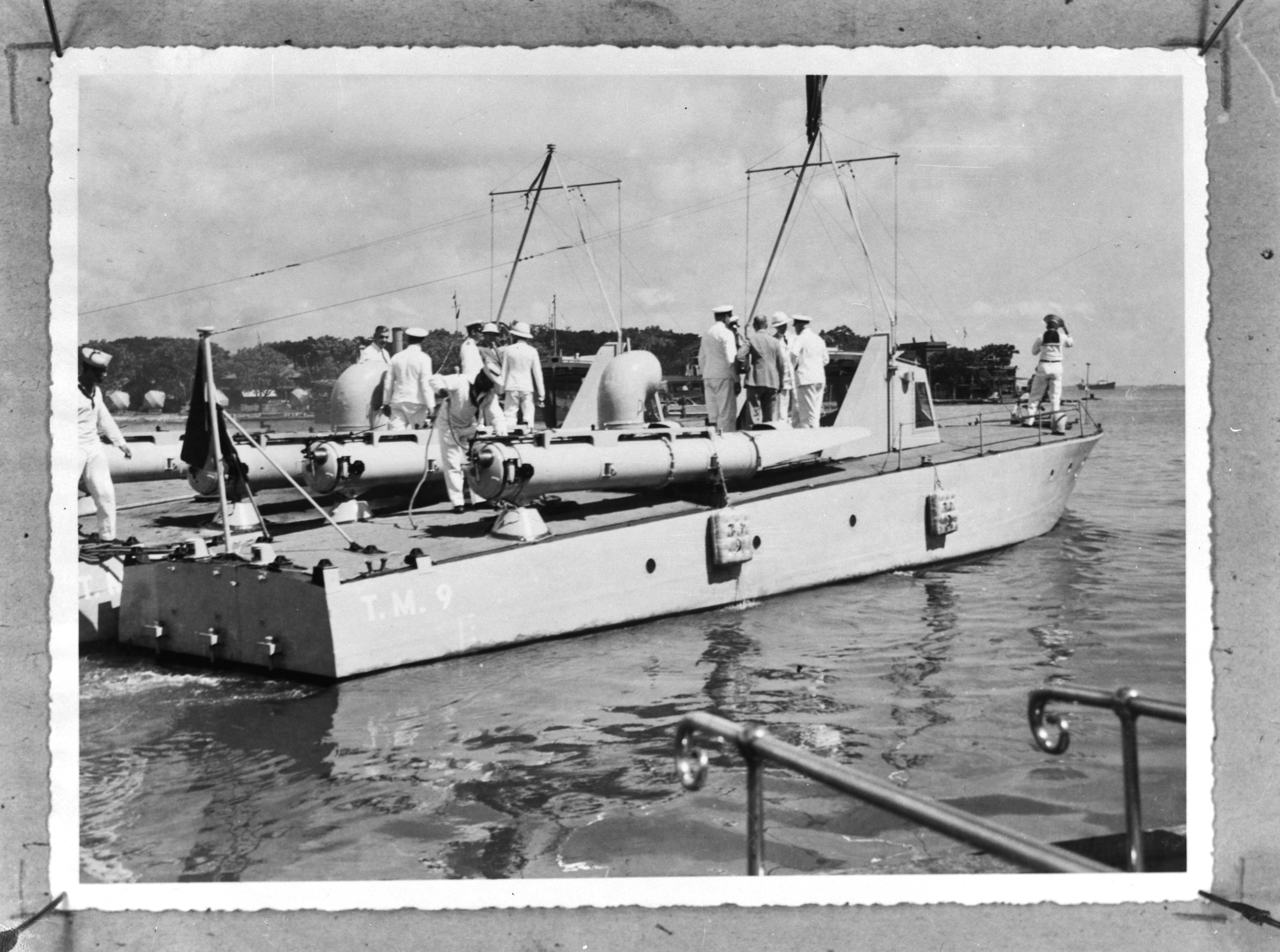 Bezoek van de ministers Welter (Koloniën) en van Kleffens (Buitenlandse Zaken) aan de marine installaties te Soerabaja, na een vaart met een torpedomotorboot naar het tegenover Soerabaja gelegen eiland Madoera waar de marine de Pyrotechnische werkplaats had gevestigd