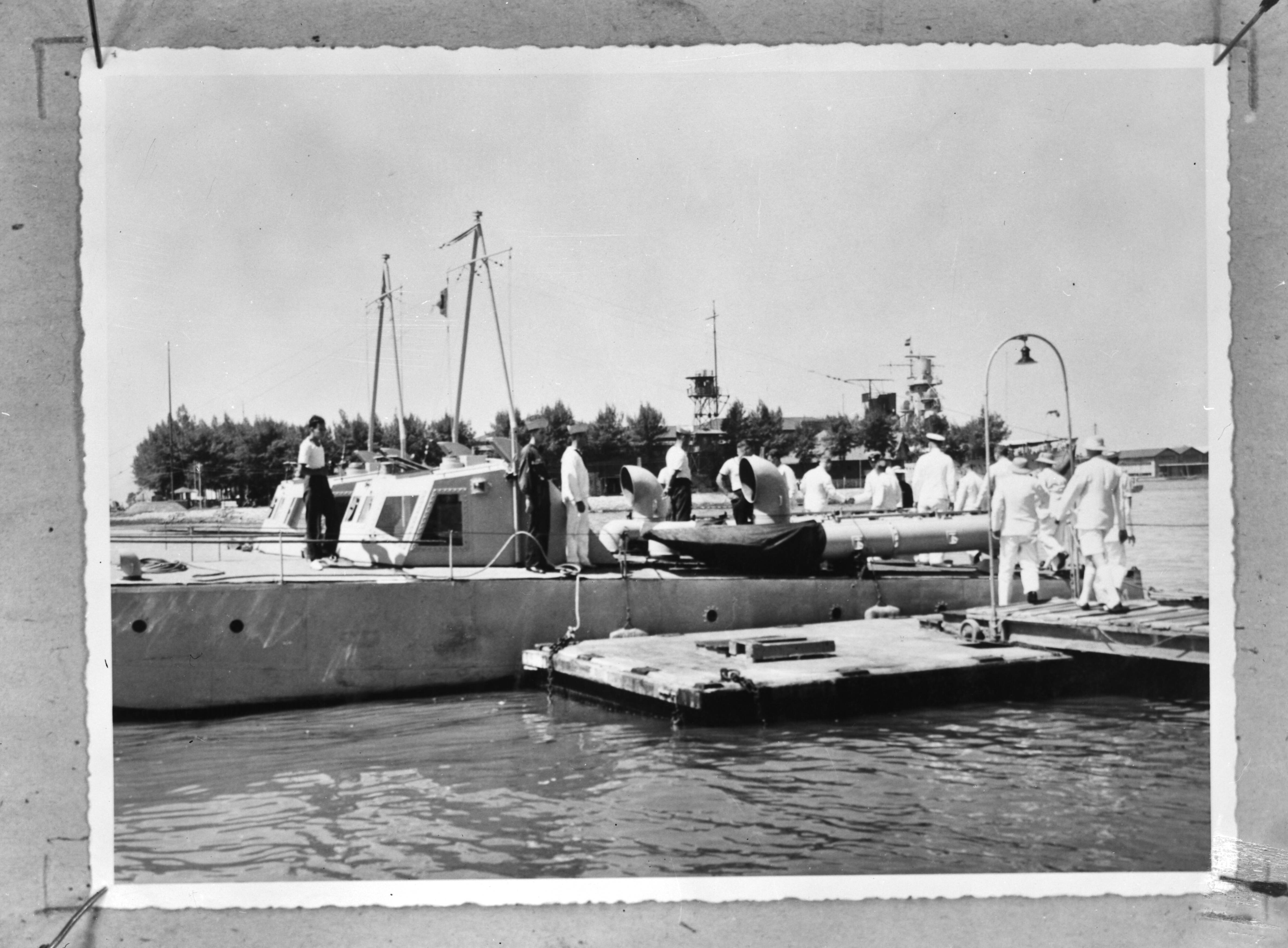 Bezoek van de ministers Welter (Koloniën) en van Kleffens (Buitenlandse Zaken) aan de marine installaties te Soerabaja, na een vaart met een torpedomotorboot naar het tegenover Soerabaja gelegen eiland Madoera waar de marine de Pyrotechnische werkplaats had gevestigd