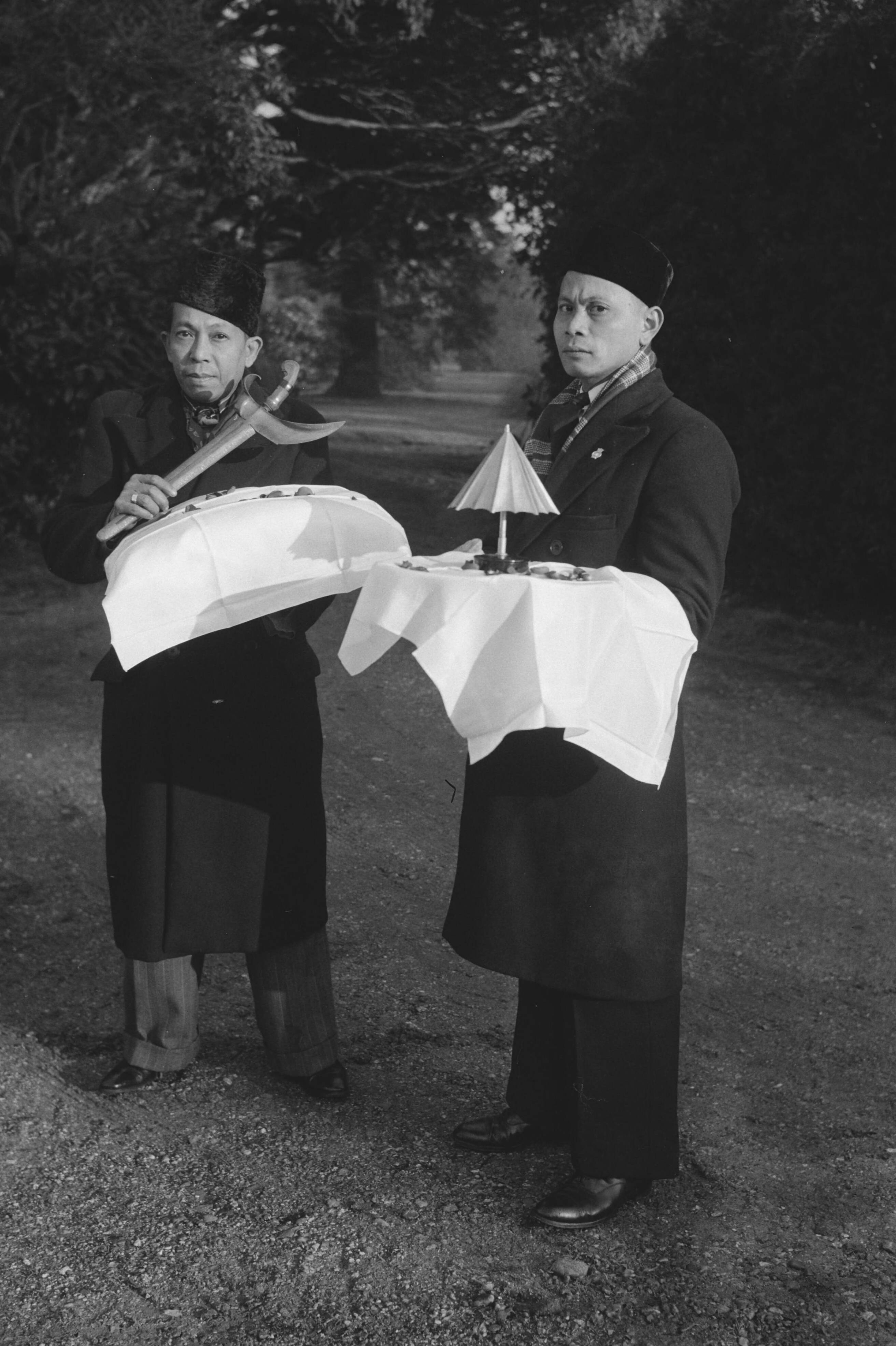 Begrafenis van minister Soejono op de Islamitische begraafplaats te Woking (Surrey). "Pajong" en kris van de overledene