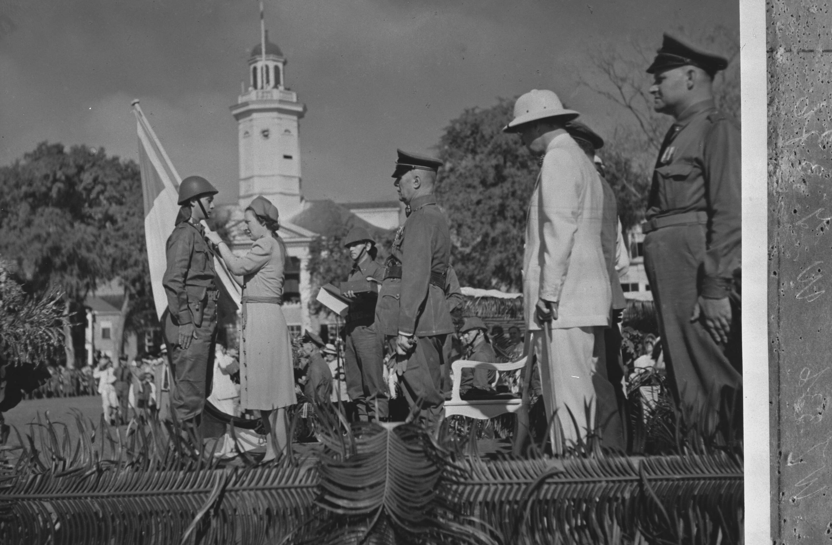Bezoek van prinses Juliana aan Suriname (1943). De prinses decoreert een Nederlandse luitenant