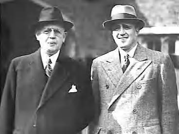 Geallieerde conferentie in Londen. M. Welter (links, minister van Koloniën) en M.P.L Steenberghe (minister van Handel, Nijverheid en Scheepvaart), bij het verlaten van de ochtend-sessie