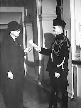 Serie Koninklijke Marechaussee in Engeland. Marechaussee overhandigt een brief aan een ambtenaar in Stratton House