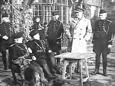 Marechaussee in Engeland. Tweehonderd marechaussees zijn erin geslaagd via België naar Engeland te vluchten, en maken nu deel uit van de krijgsmacht of verrichten politietaken voor de Nederlandse regering in Groot-Britannië. Zij zijn ingekwartierd in een gerieflijk landhuis bij Londen. Een aantal marechaussees op het terras met hun commandant kapitein Ubachs