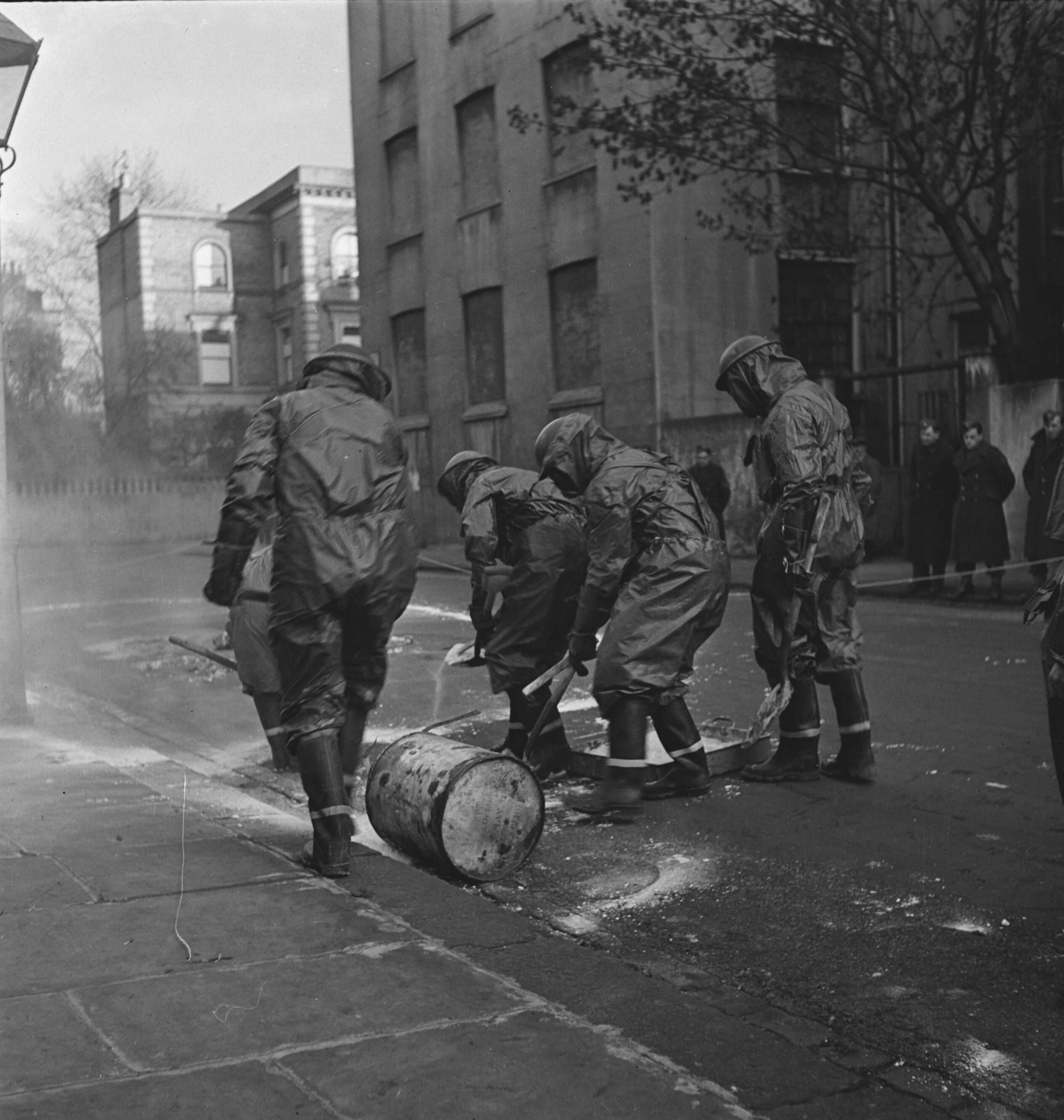 Dutch civil defence exercises / oefeningen burger bescherming. A numeber of Dutch troops in Gt. Britain are being trained in all branches of A.R.P. such as First Aid, Fire fighting, Decontamination etc. They work in close collaboration with British Civil Defense Units, which will enable them to instruct Dutch A.R.P. personell in the most up to date methods after the liberation of Holland. These photo's show the decontamination of a street in which a mustard gas bomb had fallen. Photo: Decontamination by bleach of the affected part of the street
