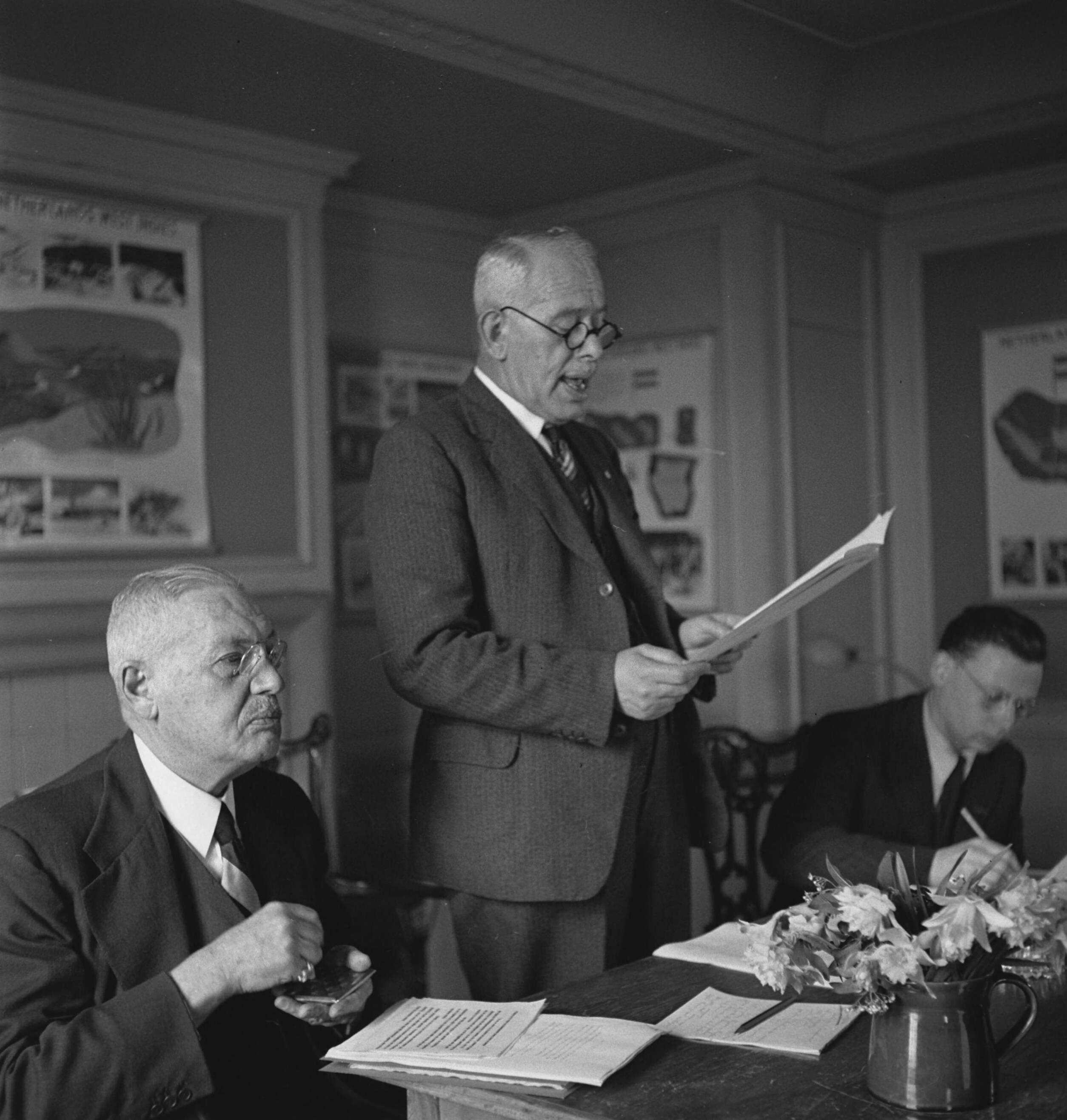 De installatie van de Tijdelijke Nederlandse Filmkeuring in Londen. Vlnr: Ch. J.I.M. Welter (voorzitter) en minister H. van Boeijen