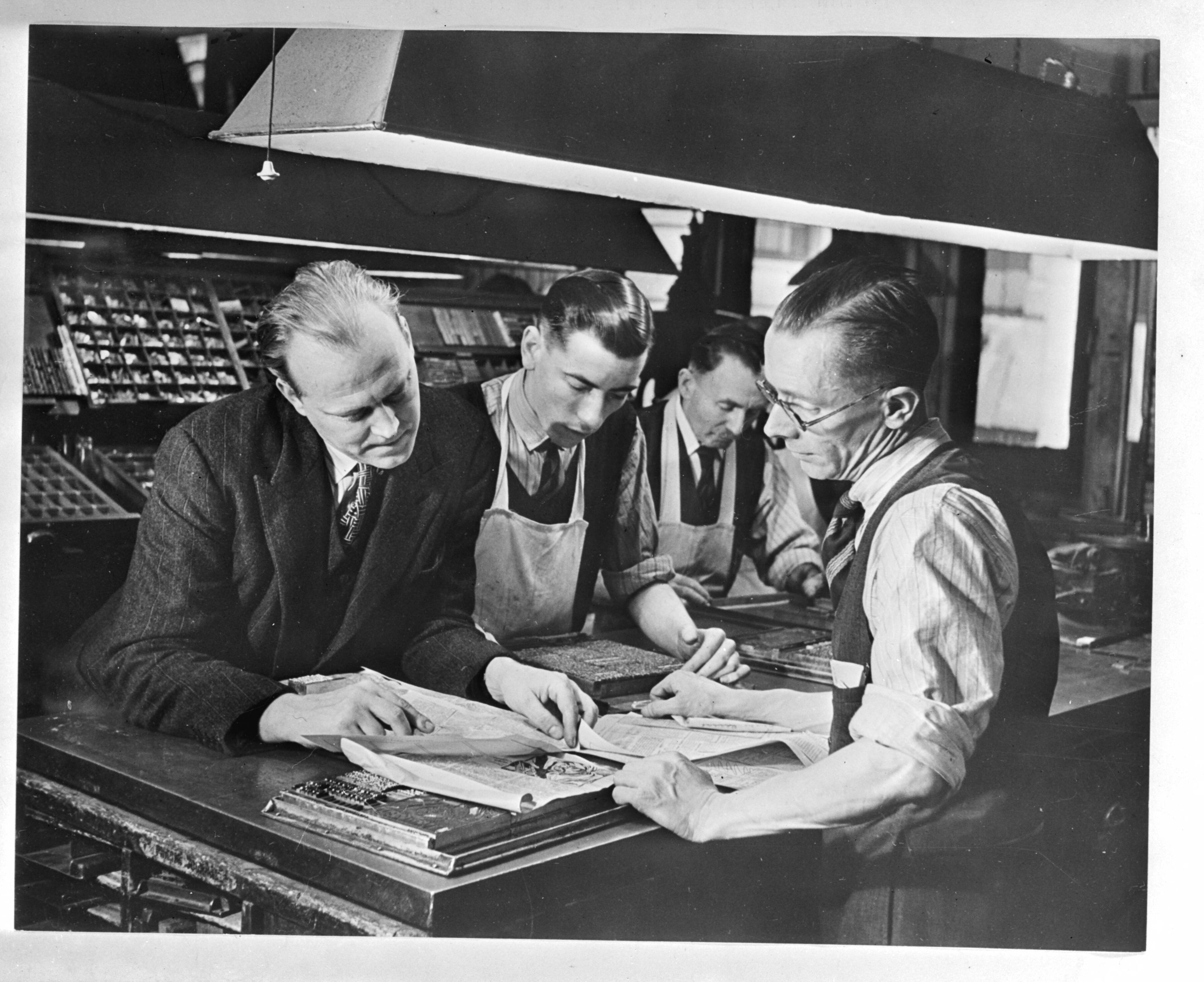 "Vrij Nederland" in Londen. De gedrukte exemplaren worden gecontroleerd. Links J. Sikkema.