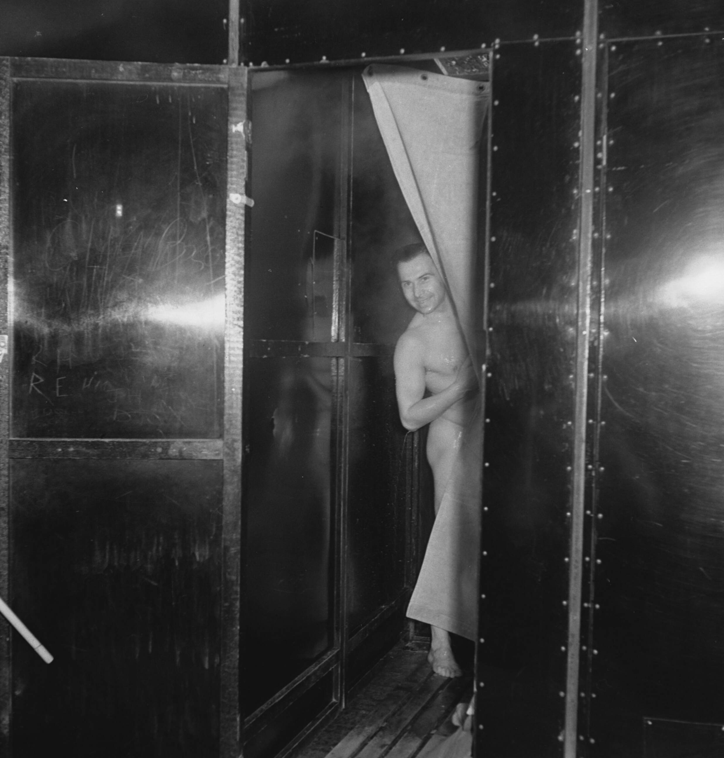 Oefening van frontsecties van het het Militair Gezag en het Vrouwen Hulp Korps in het administreren en toelaten van repatrianten in toekomstig bevrijd gebied. Een repatriant neemt een douche
