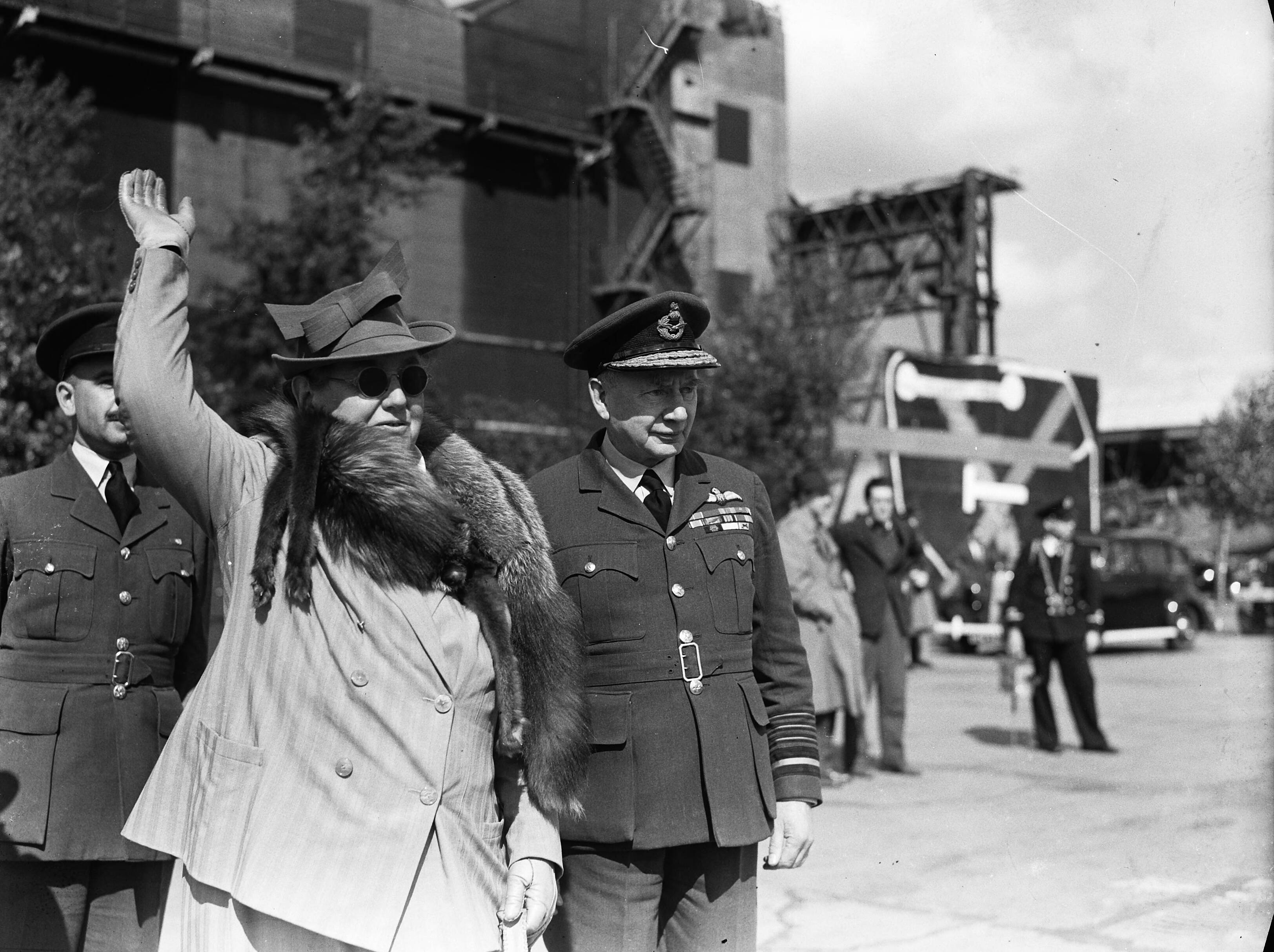 Prinses Juliana keert terug in Engeland na verblijf in Canada. Zij werd op het vliegveld opgewacht door koningin Wilhelmina. Koningin Wilhelmina wuift naar haar dochter met naast haar Air Chief Marshall sir Frederick Bowhill