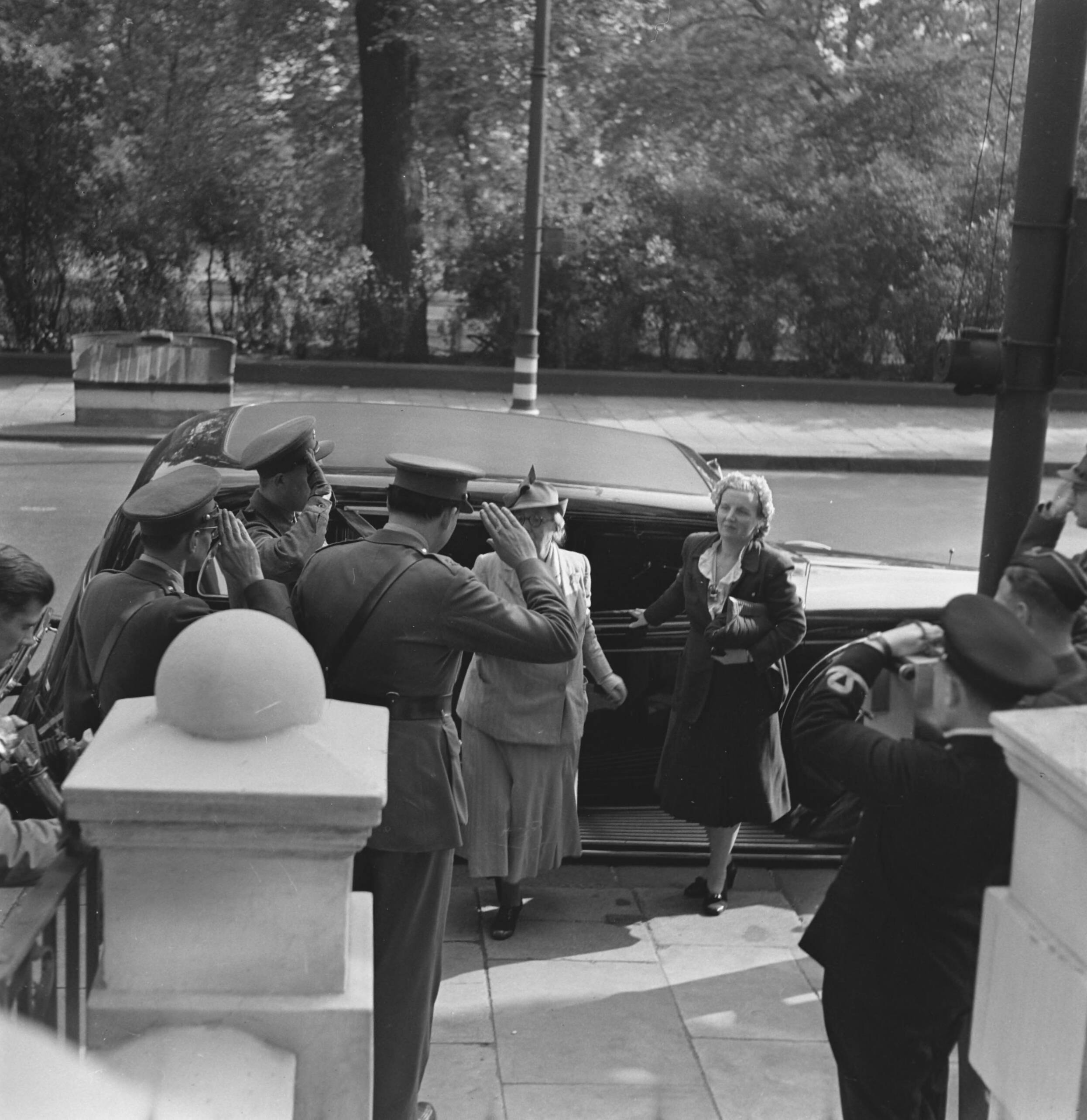 Koningin Wilhelmina en prinses Juliana brengen een bezoek aan "Oranjehaven", de Engelandvaarders club in Londen.