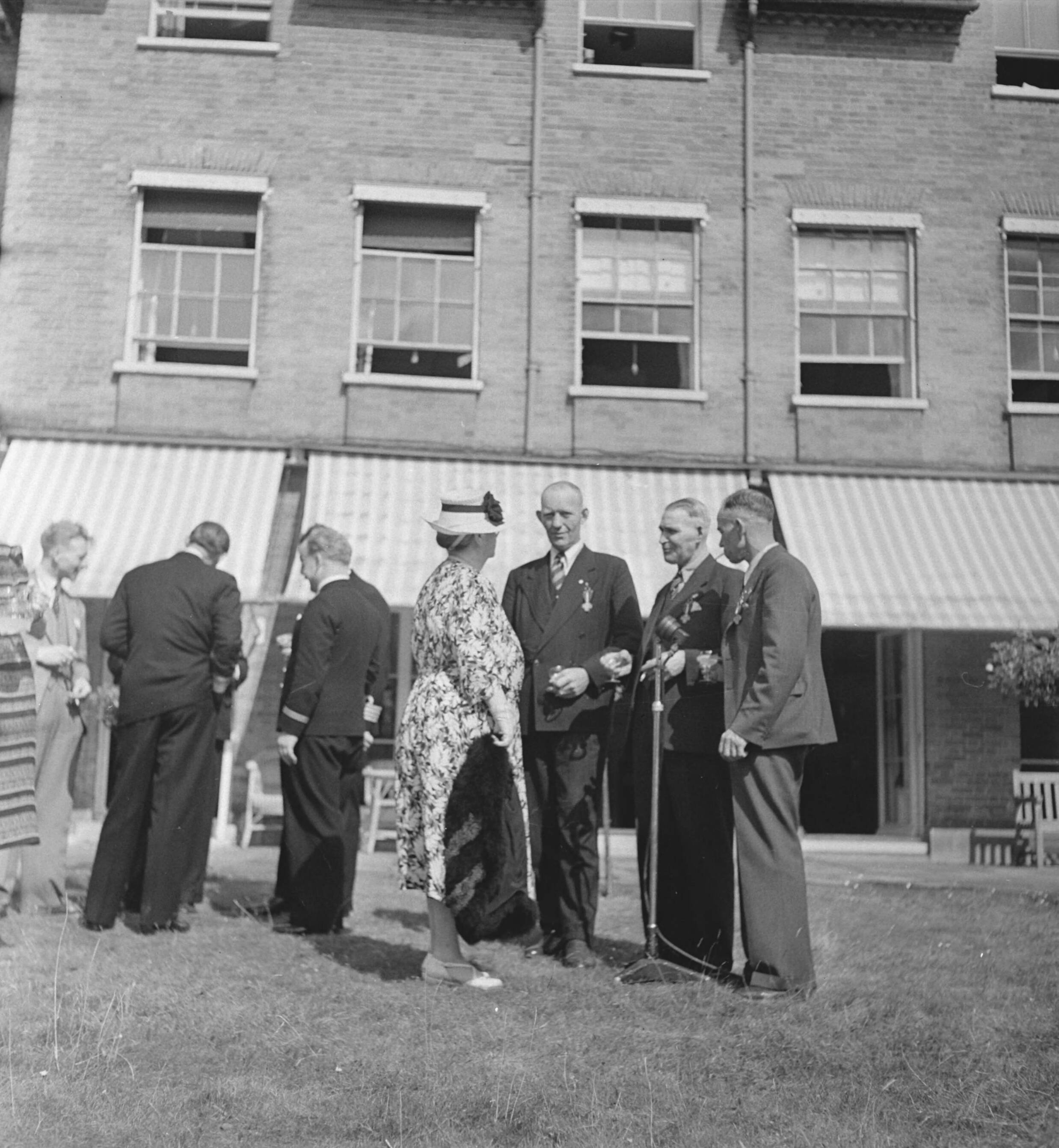 Tuin Stubbings House. Koningin Wilhelmina in gesprek met enkele gedecoreerden