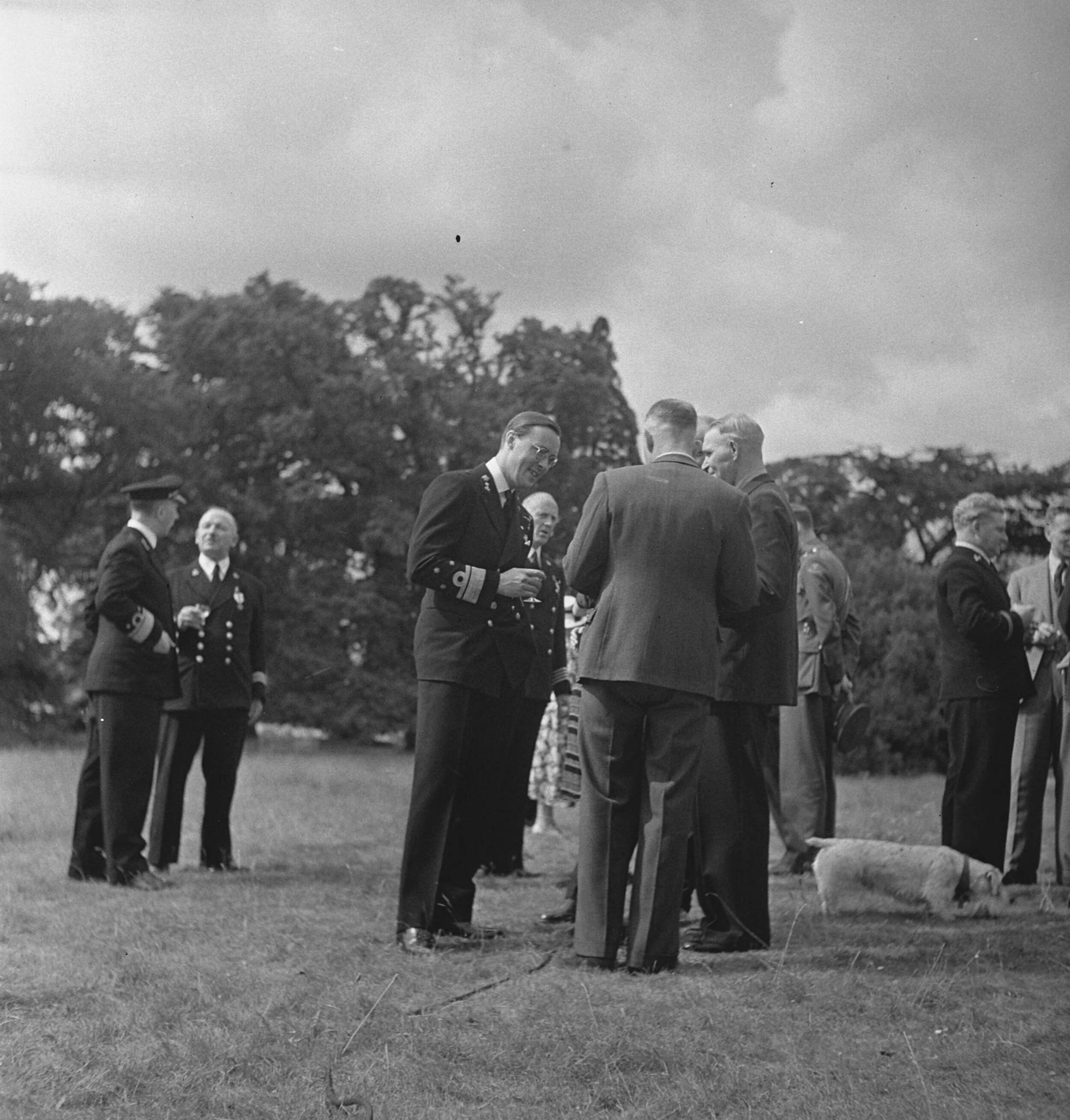 In de tuin van Stubbings House. Prins Bernhard in gesprek met gedecoreerden