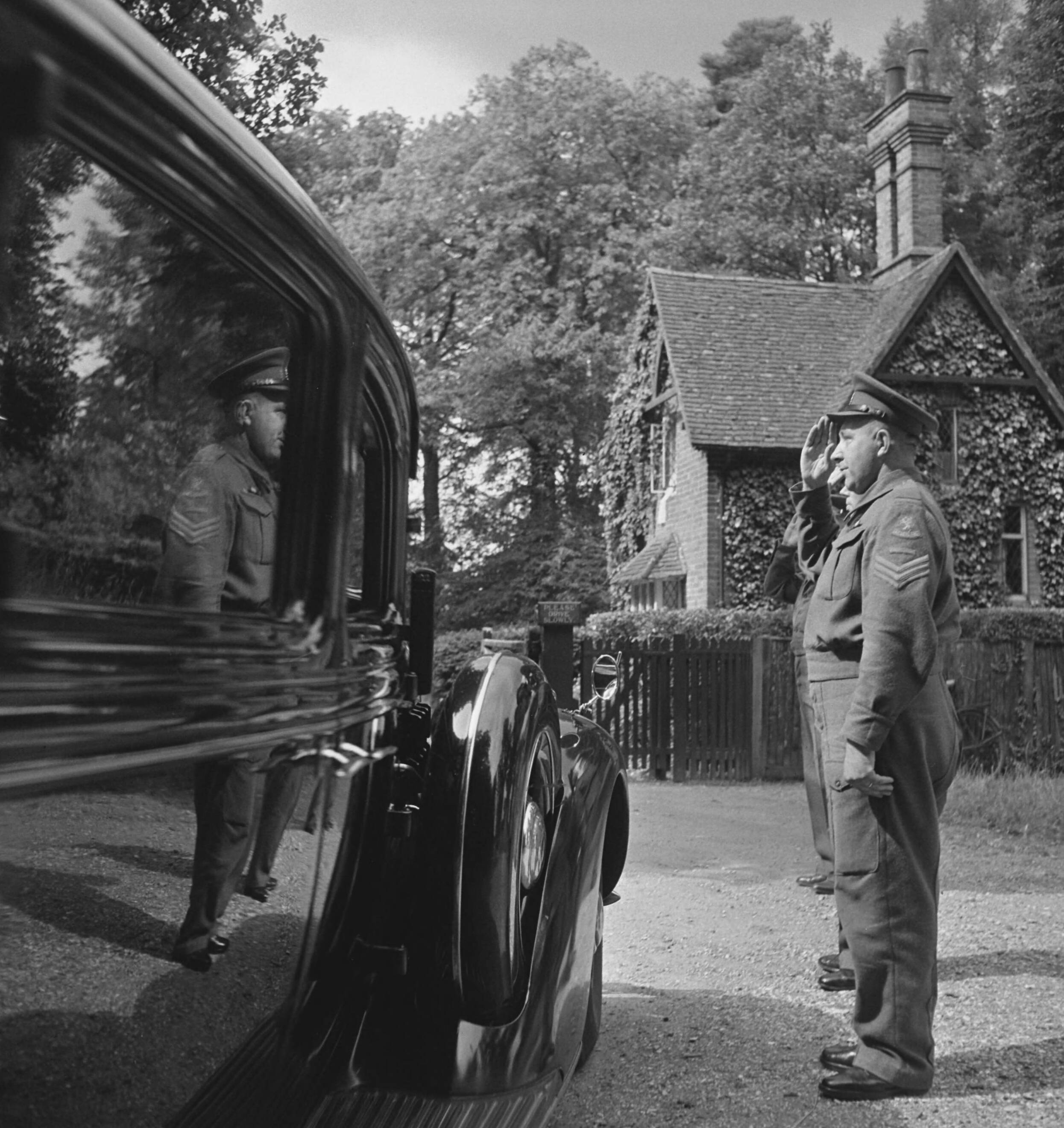 Aankomst auto met koningin Wilhelmina bij Stubbings House. Erewacht salueert