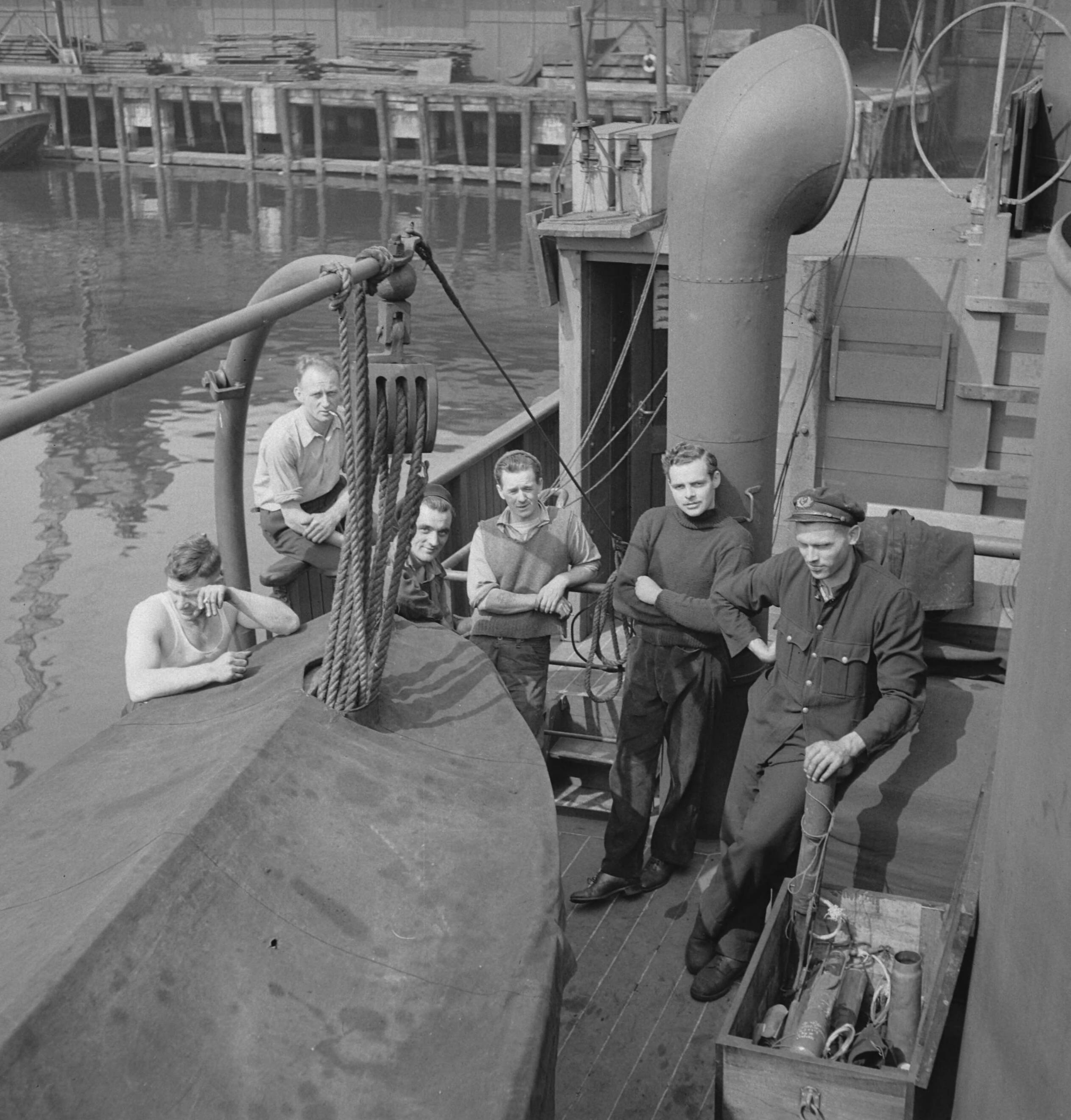 Bemanningsleden van een Nederlandse kustvaarder in geallieerde dienst, in de haven van Londen