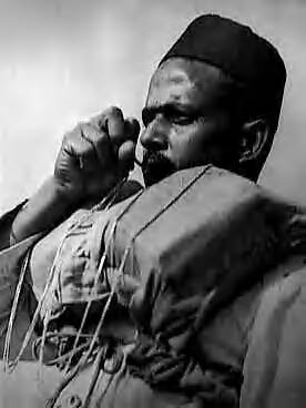 Een bootsman van de Nederlandse koopvaardij afkomstig uit Serang (Java) blaast op zijn fluit om de bemanning aan dek te roepen