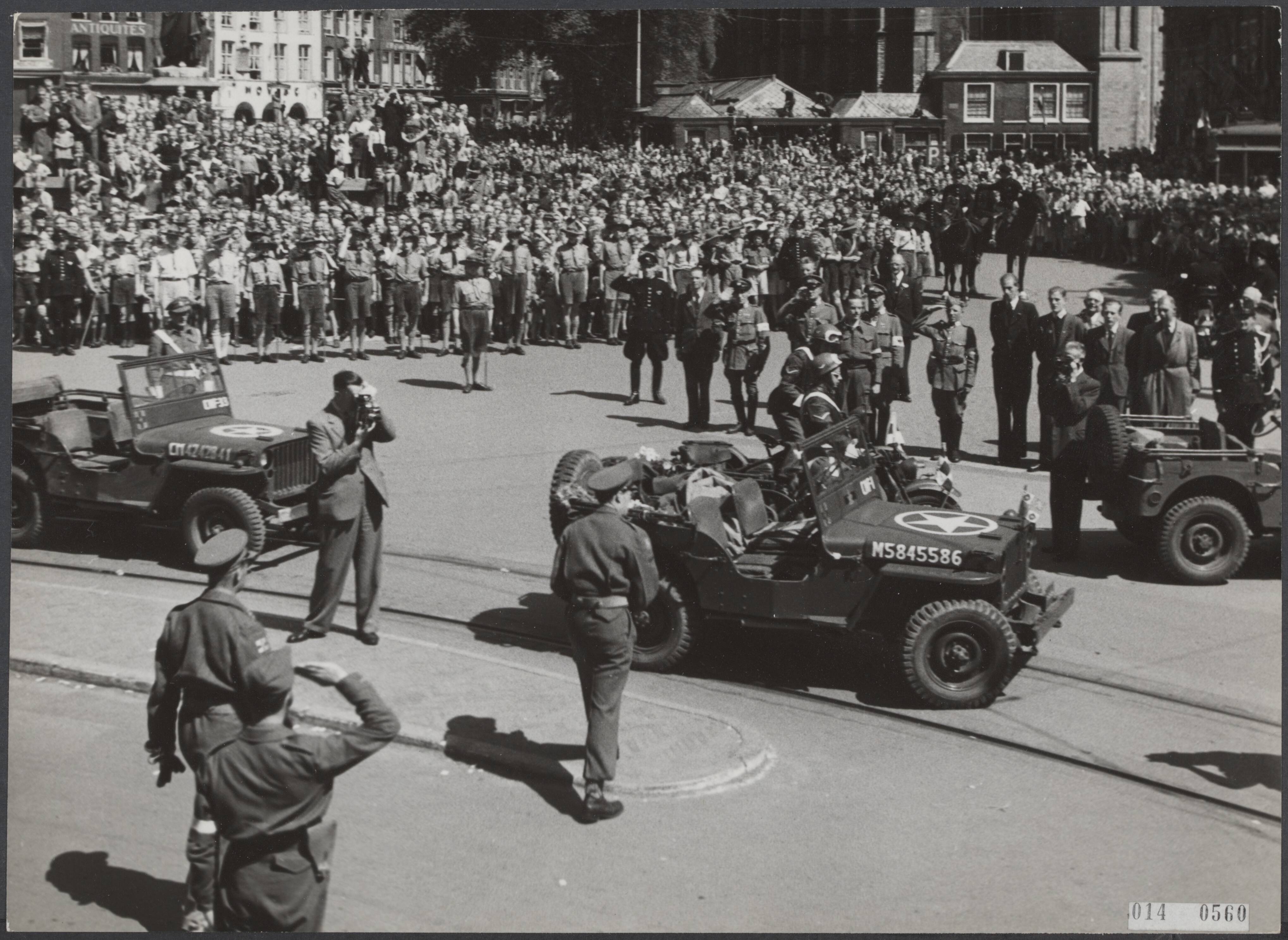 Prins Bernhard bij het verlaten van het stadhuis te Haarlem, waar hij door de burgemeester ontvangen werd