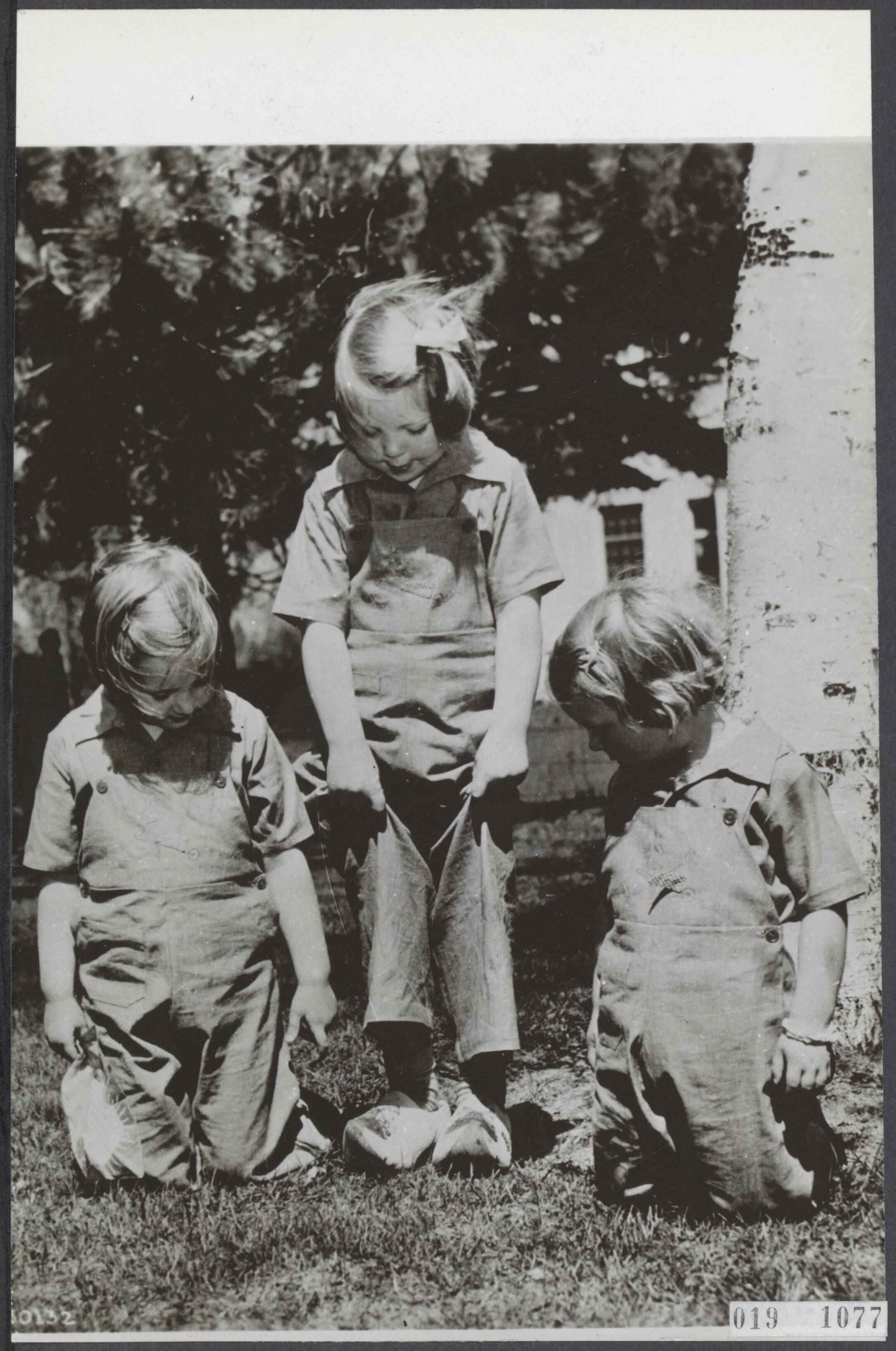 Verblijf van koningin Juliana en prinsessen in Canada tijdens de 2e Wereldoorlog. Prinses Beatrix (midden) laat haar nieuwe klompen zien aan prinses irene (rechts) en Renée Röell