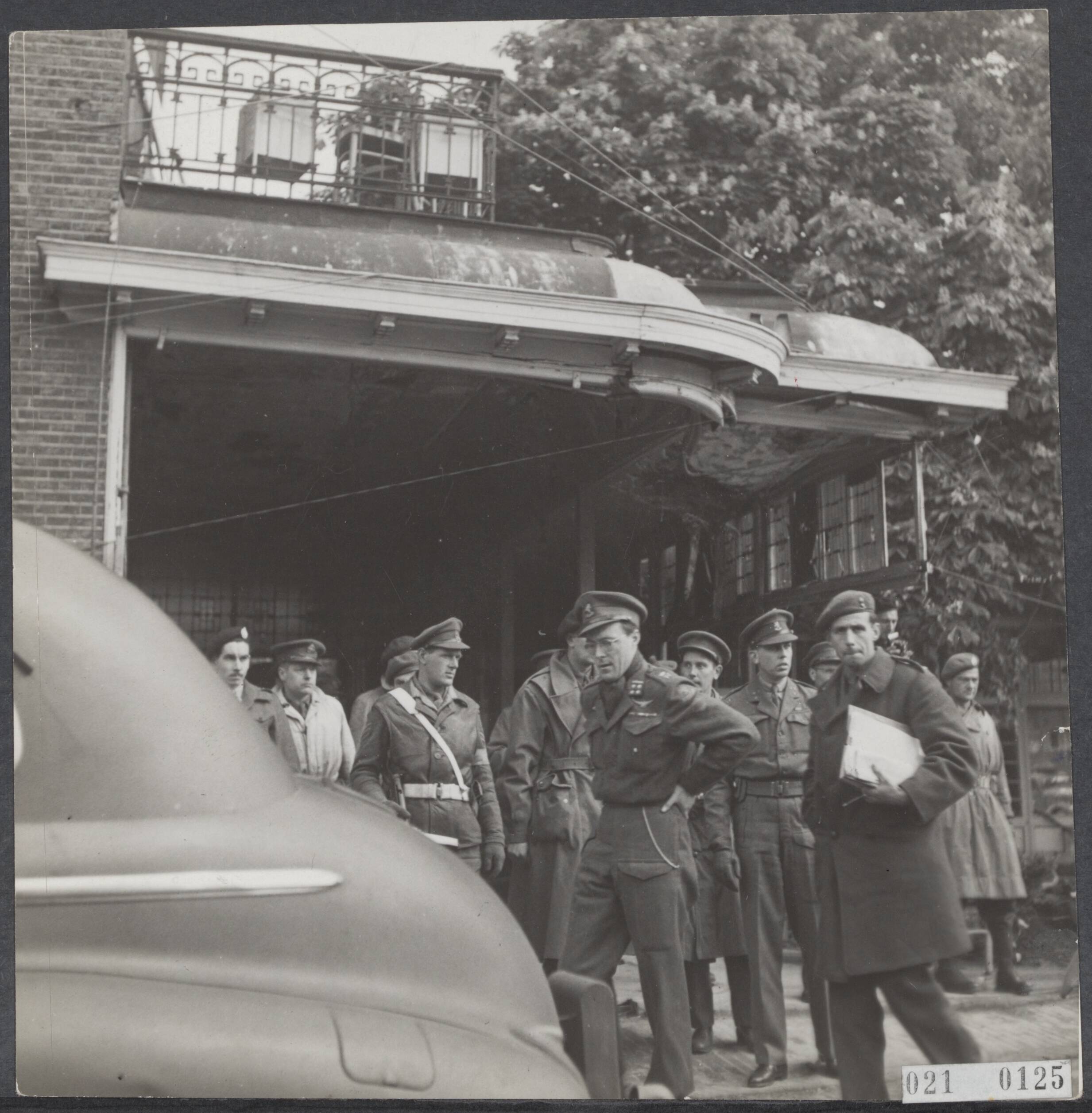Prins Bernhard voor Hotel de Wereld waar besprekingen over de uitvoering van de capitulatievoorwaarden met de bevelhebber van de D...