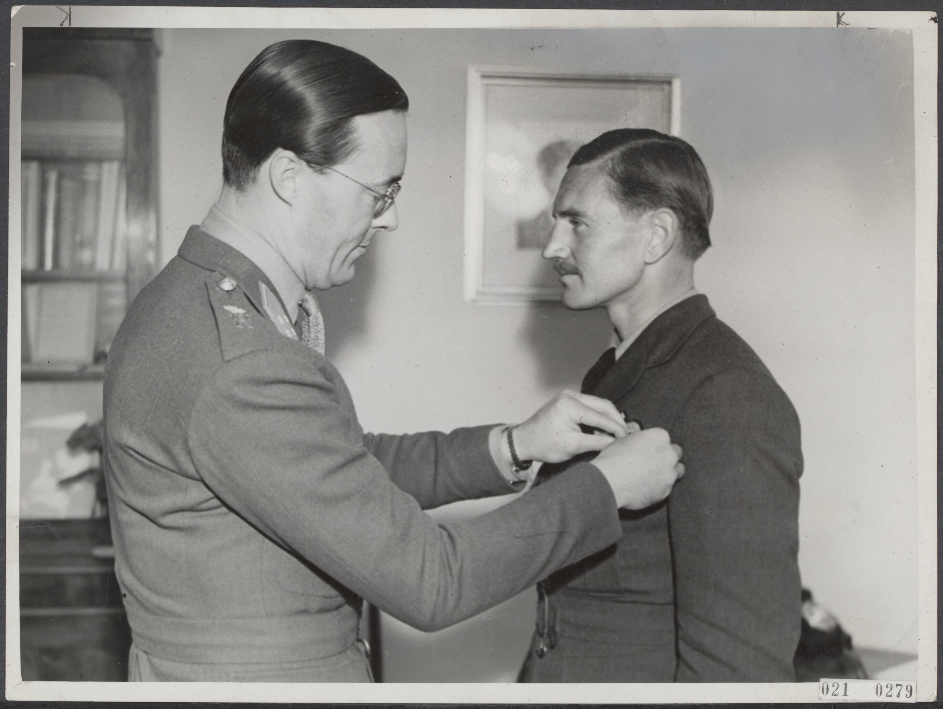 Uitreiking van het Vliegerkruis aan de Britse RAF-vlieger, Wing Commander R.N. Bateson. Bateson voerde het bevel over een formatie Mosquito-jachtbommenwerpers bij een aanval op 11 april 1944 op Huize Kleykamp in Den Haag, waar een duplicaat van een deel van het centraal bevolkingsregister was ondergebracht