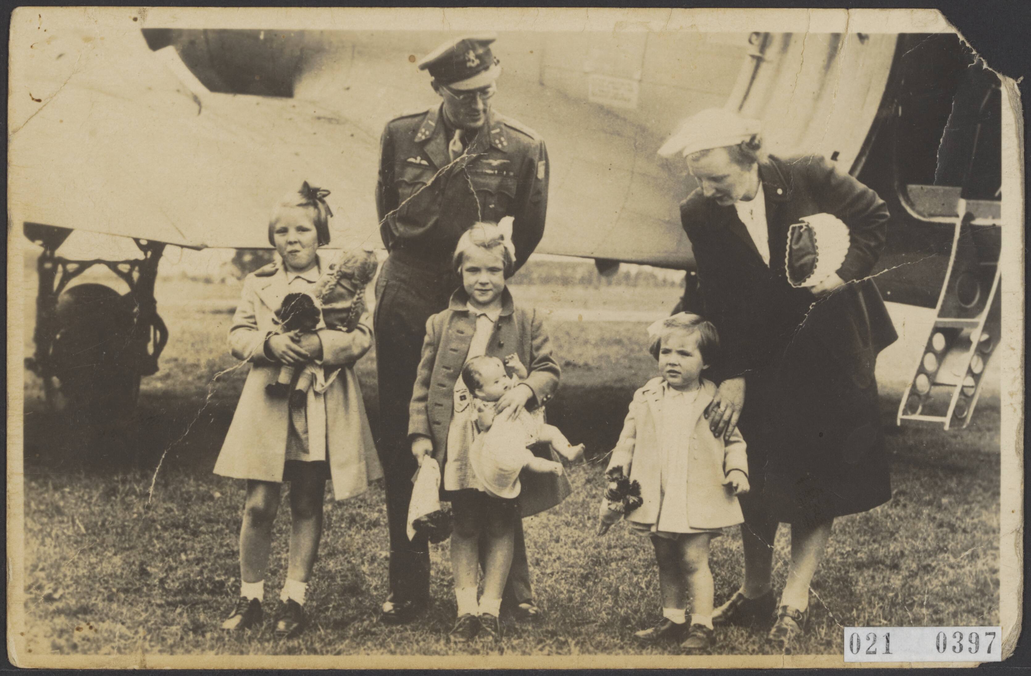 Aankomst prinses Juliana en haar drie dochters in Nederland op vliegveld Teuge . v.l.n.r.