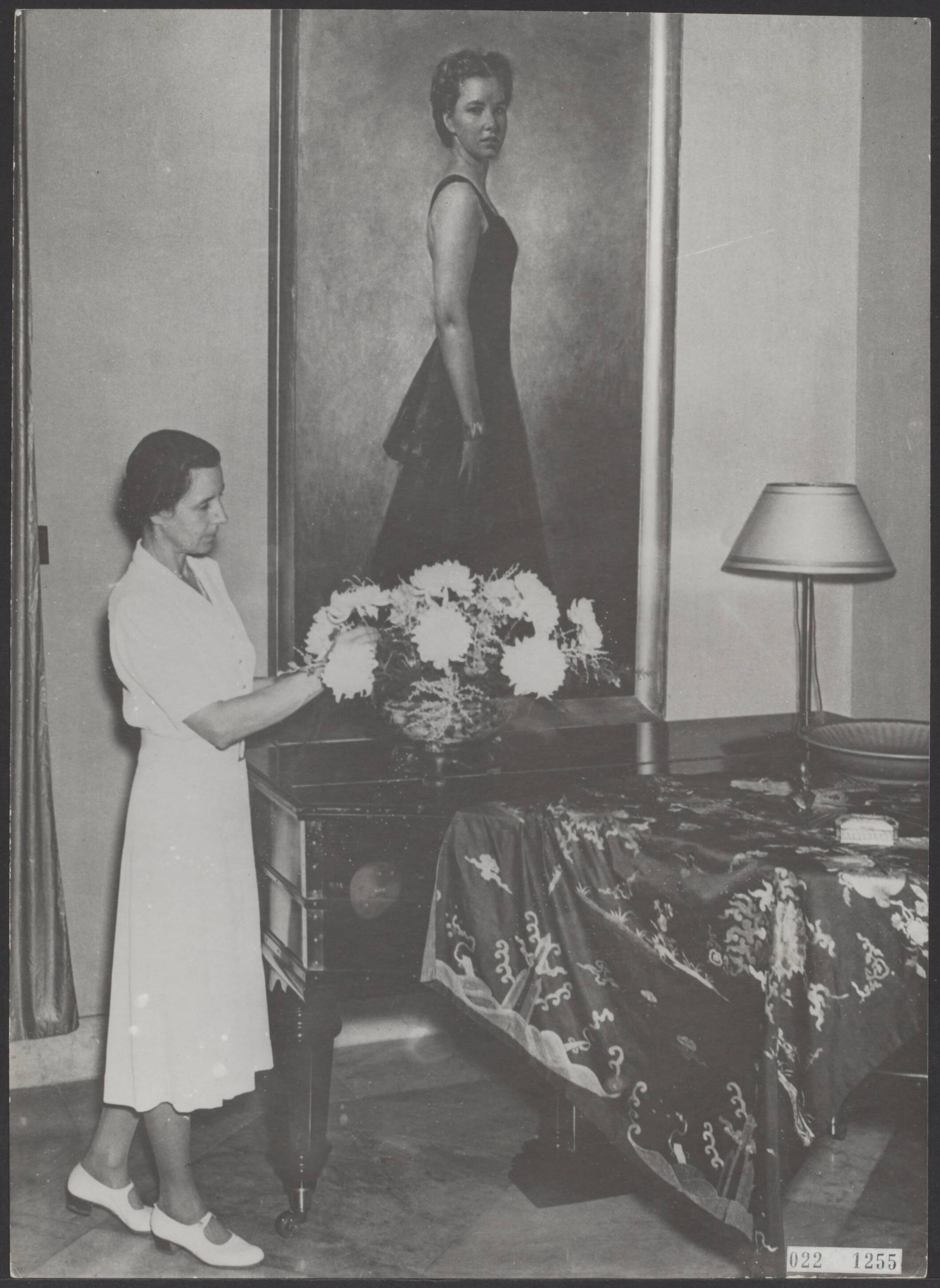 Mevrouw Tjarda van Starkenborg Stachouwer, de echtgenote van de gouverneur-generaal van Nederlands-Indië, in haar woning te Batavia. Op de achtergrond een levensgroot portret van hun dochter