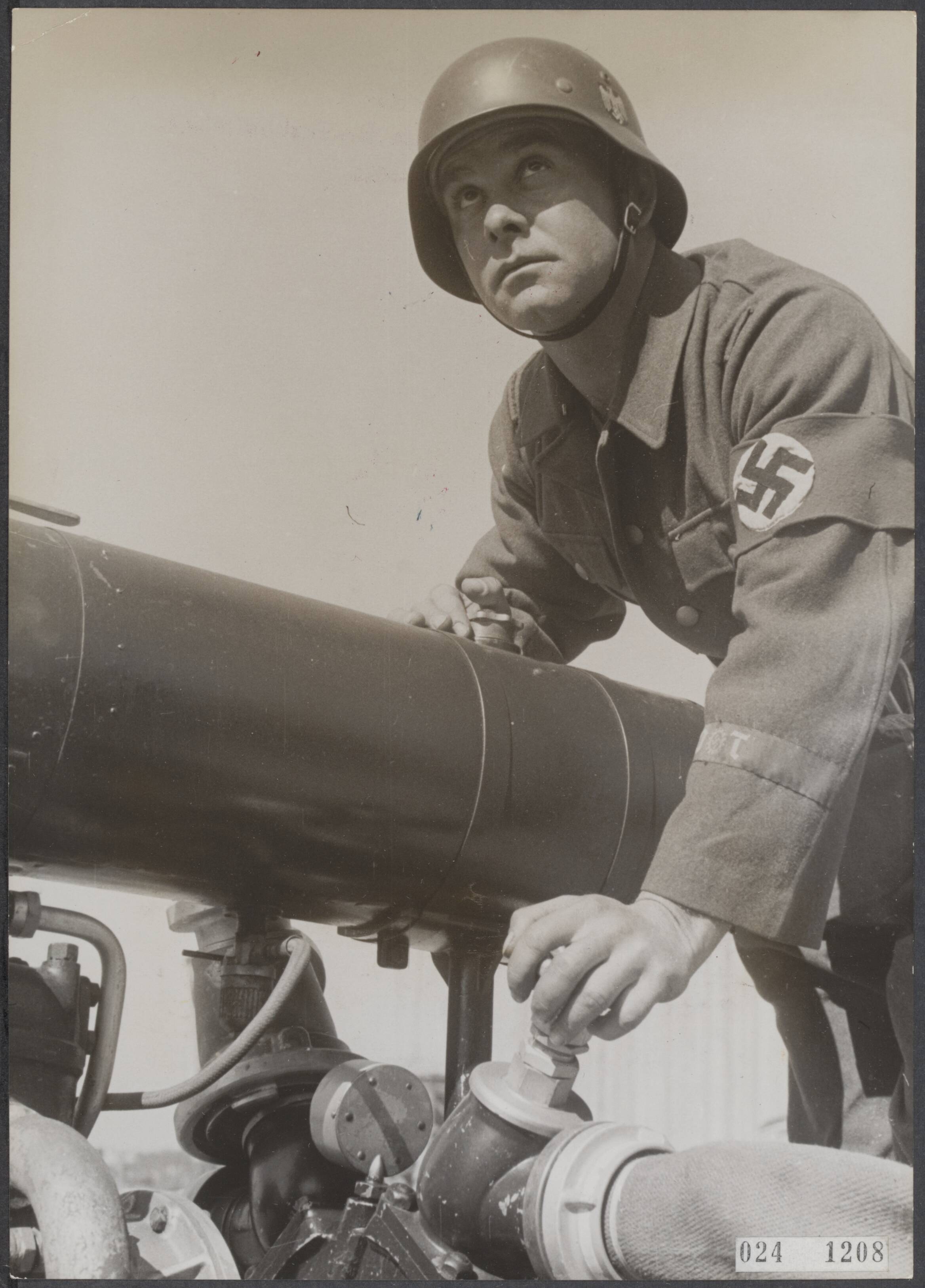 Bijschrift "Feuerschutz am Atlantik. Nach der Übung Dienstbesprechung. Den Männern der O.T. wird hier von der Berufsfeuerwehr Anweisung gegeben, wie man manches noch besser und schneller machen kann.". Duitse brandweer Organisation Todt