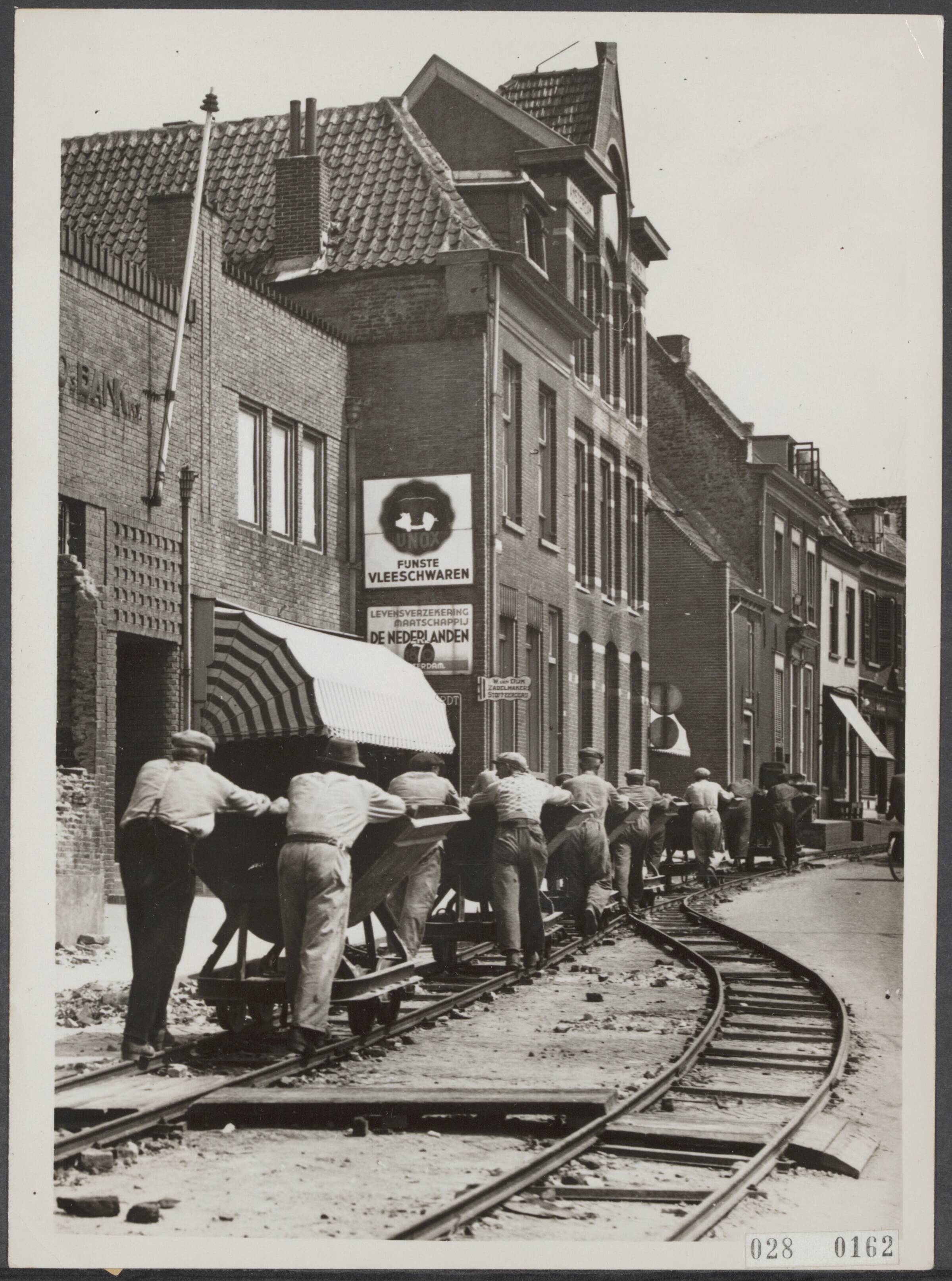 Rhenen heeft de hand aan de ploeg geslagen, om de wederopbouw in de kortst mogelijke tijd te verwezenlijken. De arbeiders die het opruimingswerk verrichten, zijn er thans bekende figuren in het straatbeeld.
