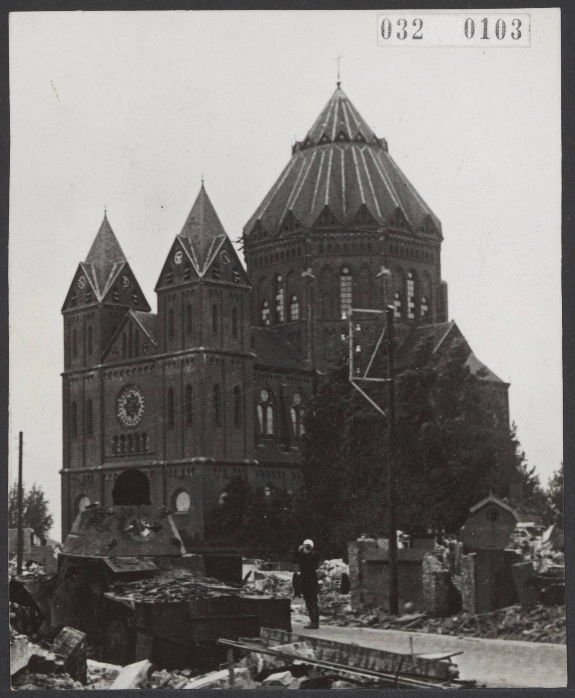 Verwoestingen door Duitse bombardementen rond de kerk van Zevenbergschen Hoek in de meidagen van 1940. De kerk zelf bleef gespaard