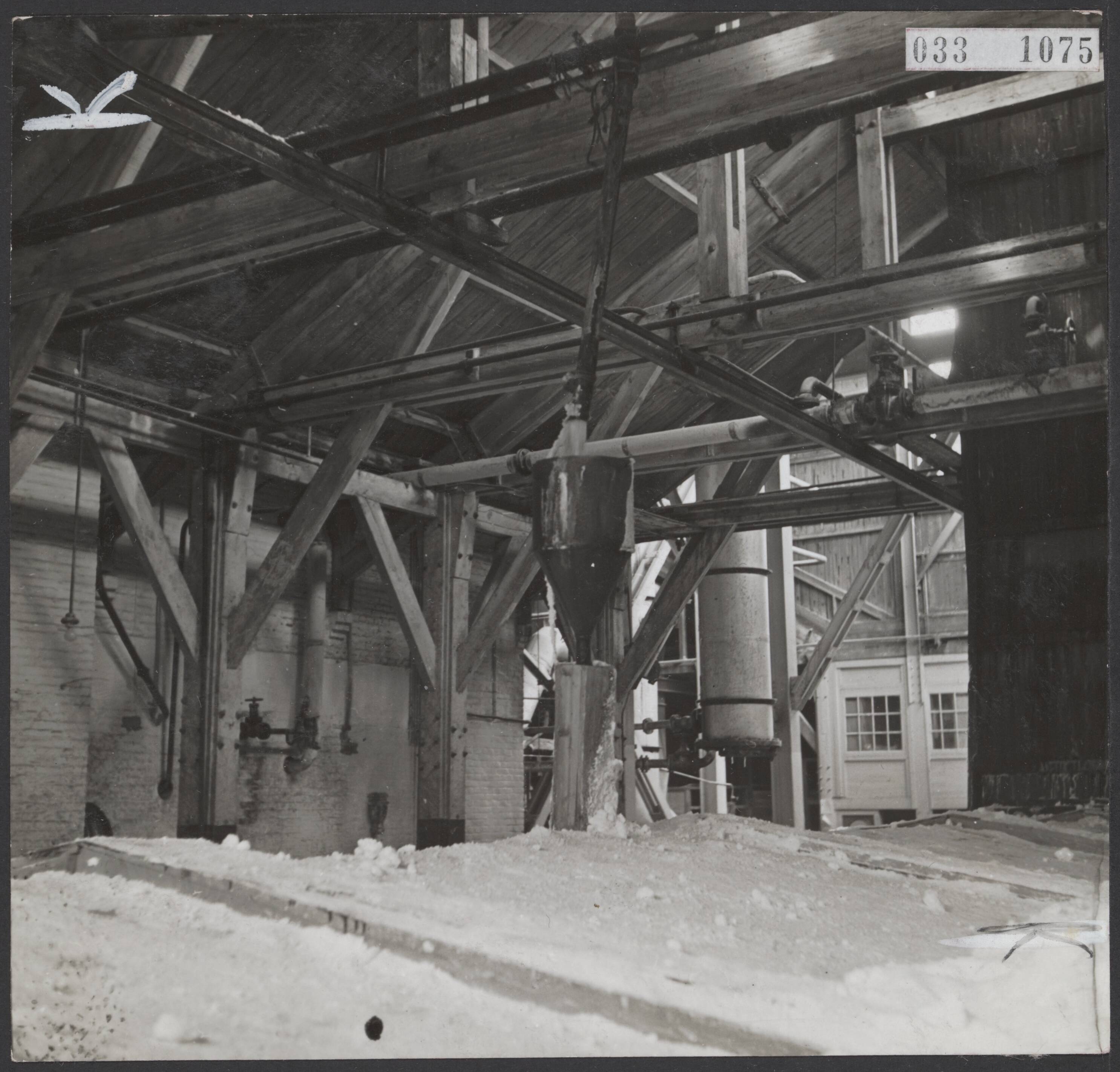 Koninklijke Nederlandse Zoutindustrie te Boekelo en Hengelo. Zoutwinning. Uit een buis stroomt het zout van de zoldering