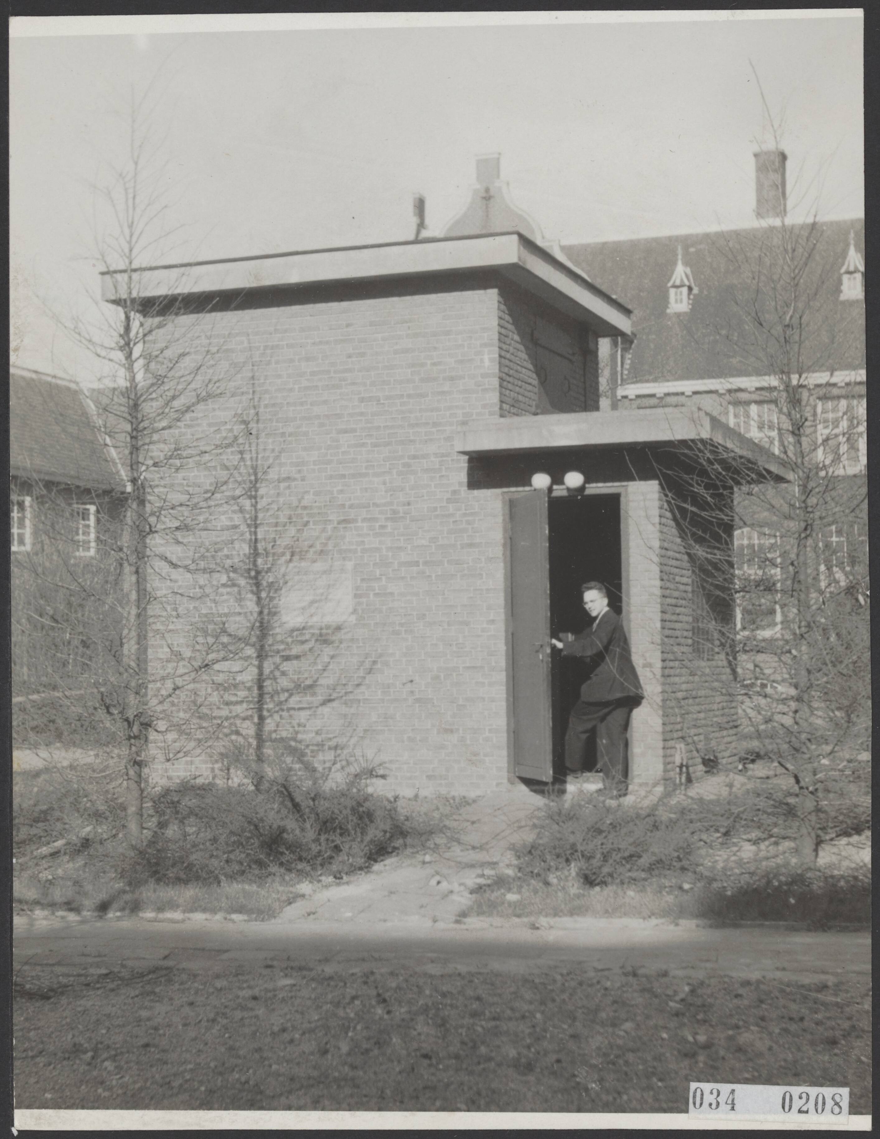 Serie "Geluidstichting". In dit huisje werden de verschillende constructies, die voor de studiobouw in Hilversum nodig waren, beproefd. Tegenwoordig gebruikt men het gebouwtje voor het beproeven van luchtbeschermingssirenes. Daar het gebouwtje volkomen geluiddicht is, kan men er een sirene in laten loeien, zonder dat iemand er buiten ook maar iets van hoort. De bevolking wordt er dus niet door verontrust als hier de ganse dag de sirenes werken.