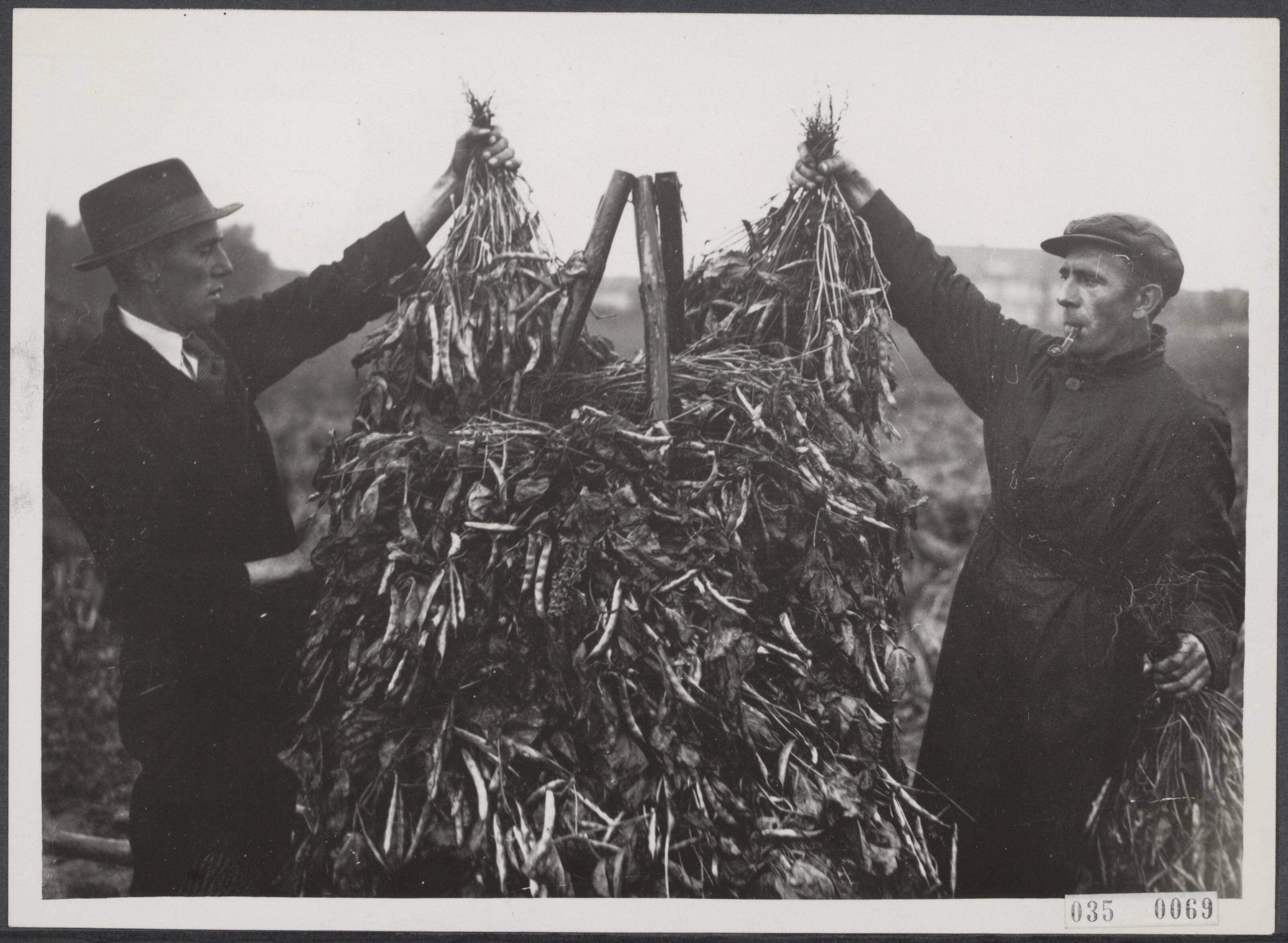 Bijschrift "Bij het drogen der bonen volgt men hier de Zeeuwse methode door het zgn 'optollen' der bonen"