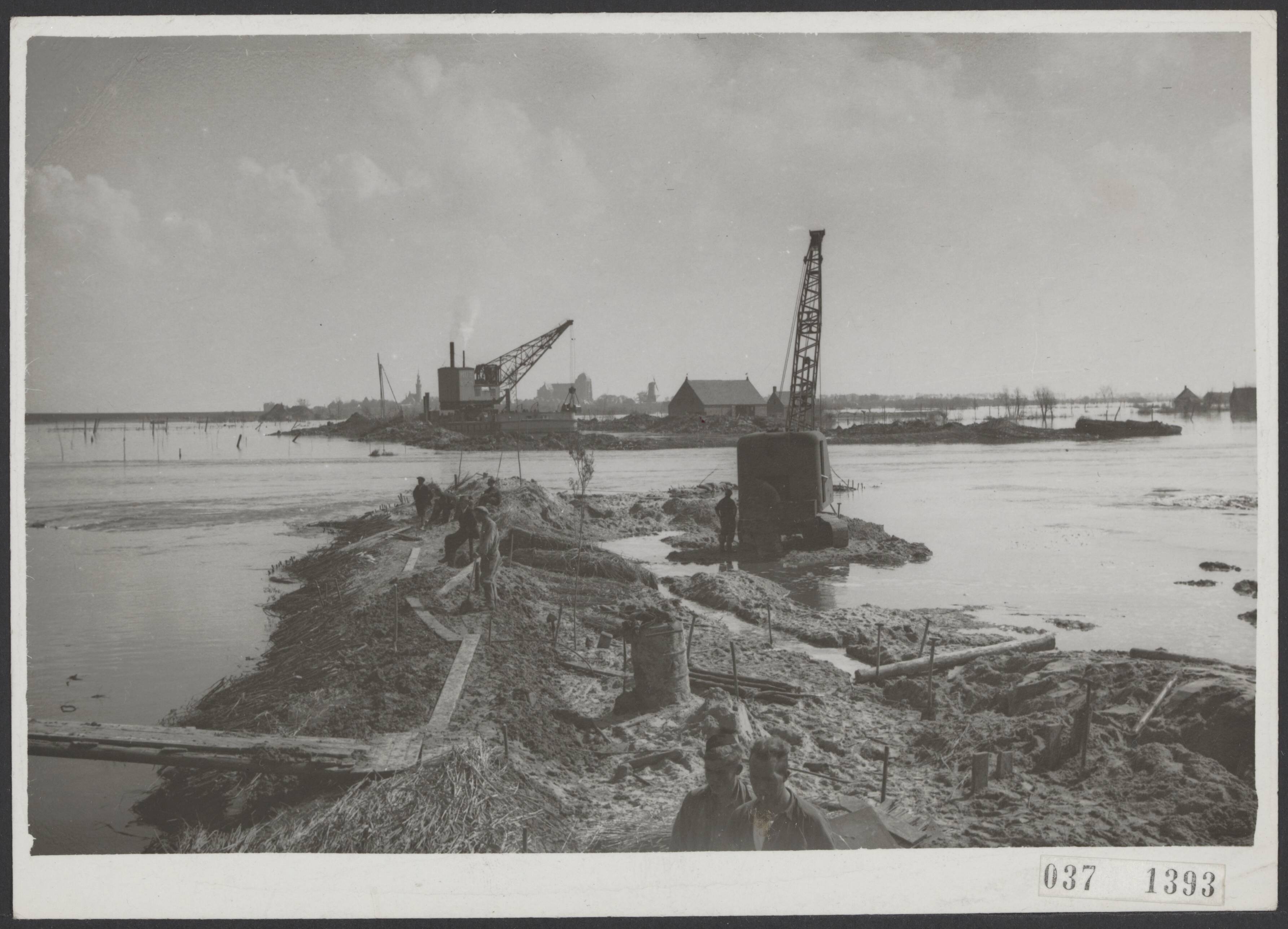 Serie Walcheren. Dijkherstel bij Veere Op de achtergrond de zware kerk en het stadhuistorentje van Veere