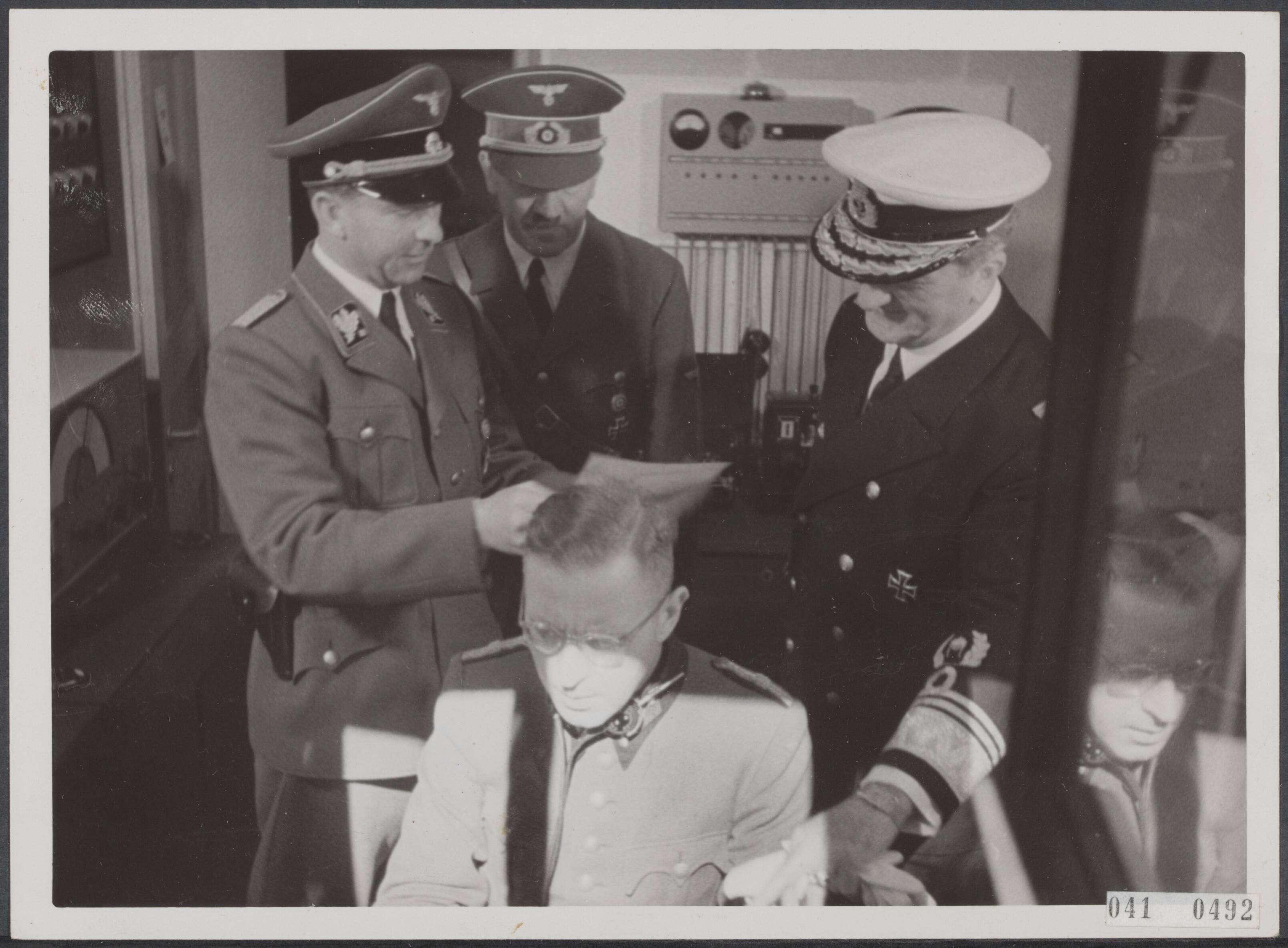 De Hongaarse regent Miklos Horthy (rechts) op bezoek in het hoofdkwartier van Adolf Hitler (midden) te Berlijn. In de studie van de radio-nieuwdienst, links de Duitse perschef dr. Dietrich