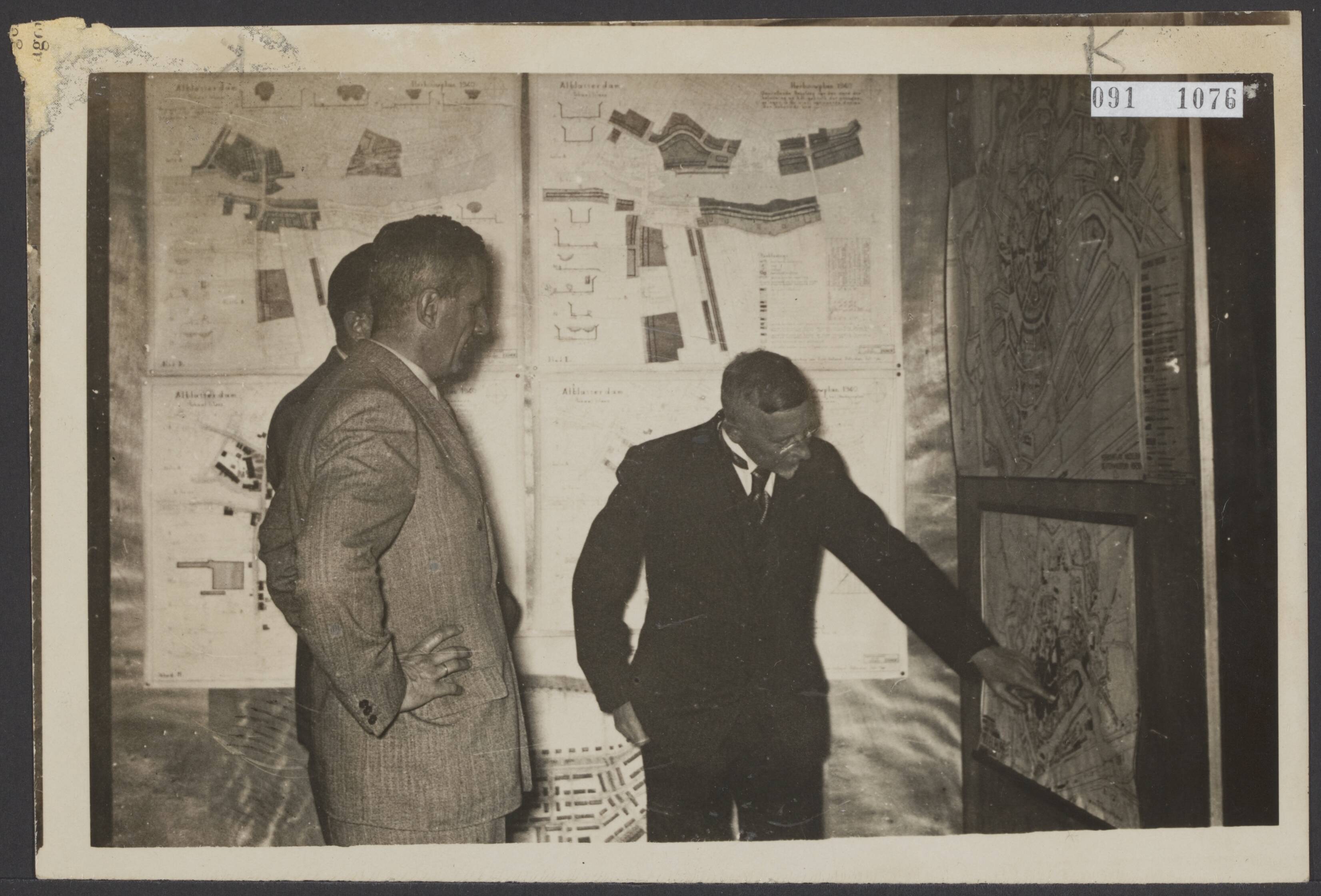 De commissaris-generaal voor Economie en Financiën, dr. H. Fischbock toonde zijn belangstelling voor de wederopbouw toen hij in Den Haag een kleine expositie van de plannen voor de herbouw van de verschillende gemeenten bezichtigde. Dr. Fischbock wordt voorgelicht door dr. ir. J.A. Ringers, de regeringscommissaris voor de Wederopbouw