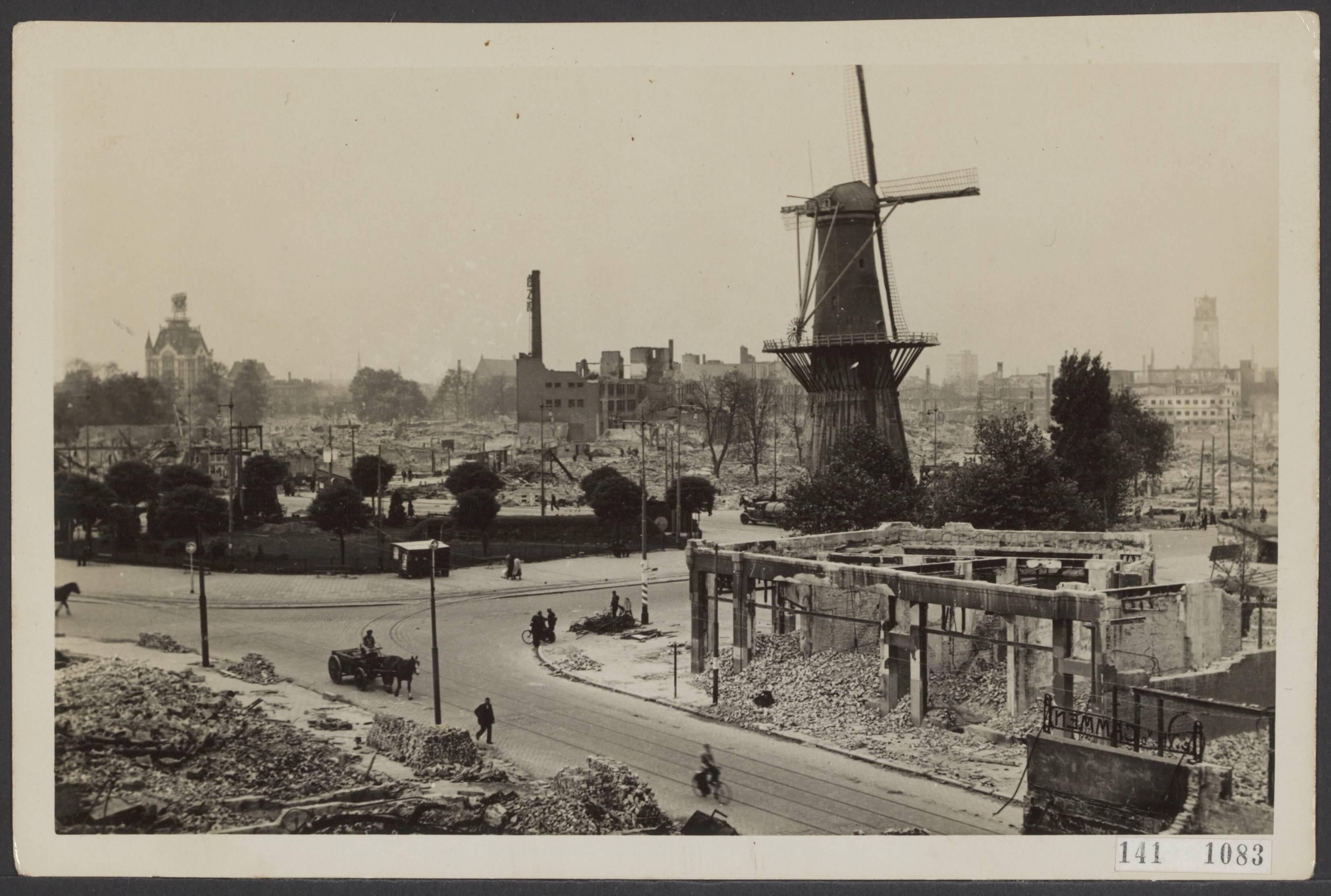 Oostplein. Wonderlijk bleef de oude molen gespaard tussen de ruïnes