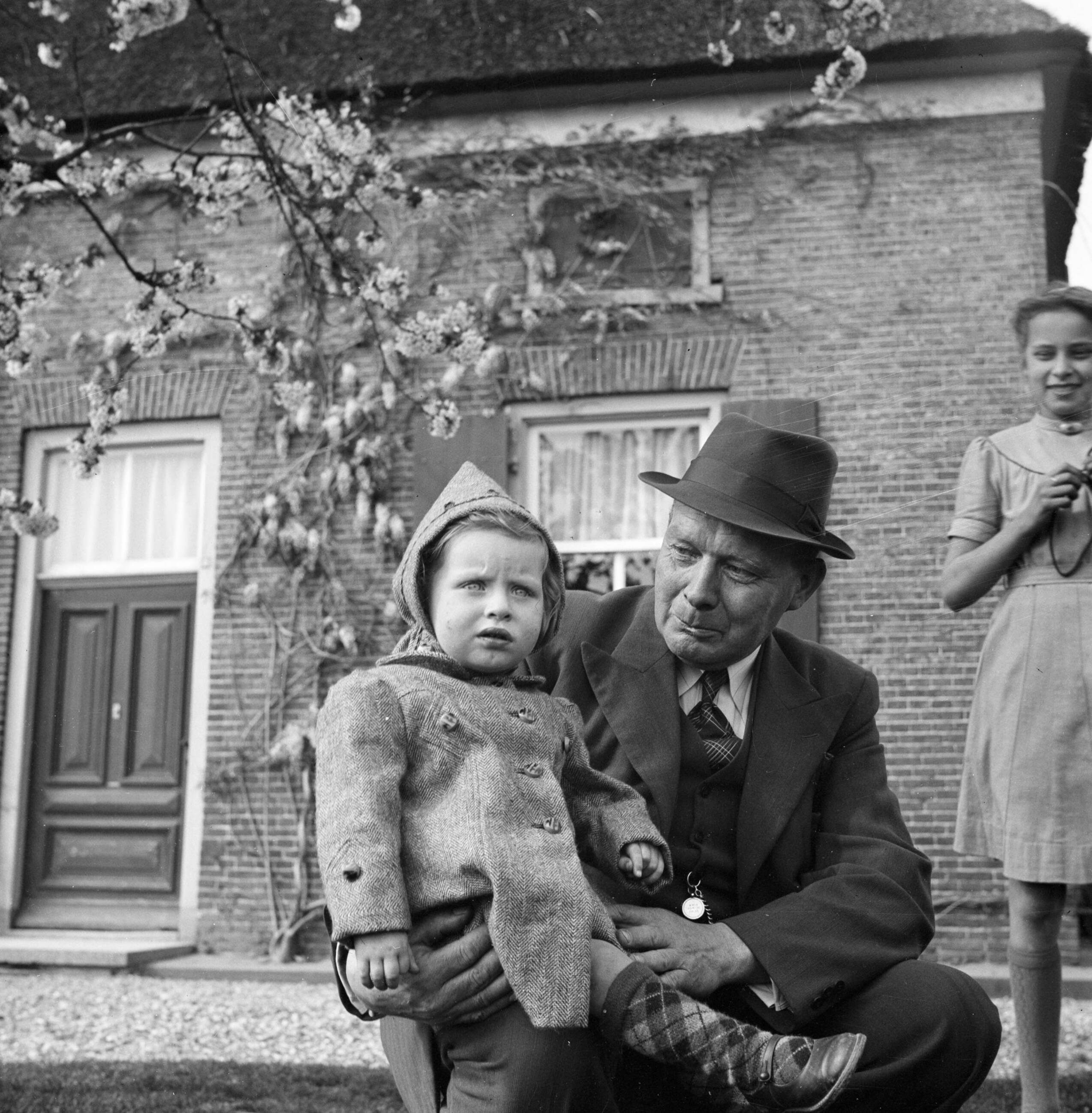 Oude man met meisje voor de boerderij