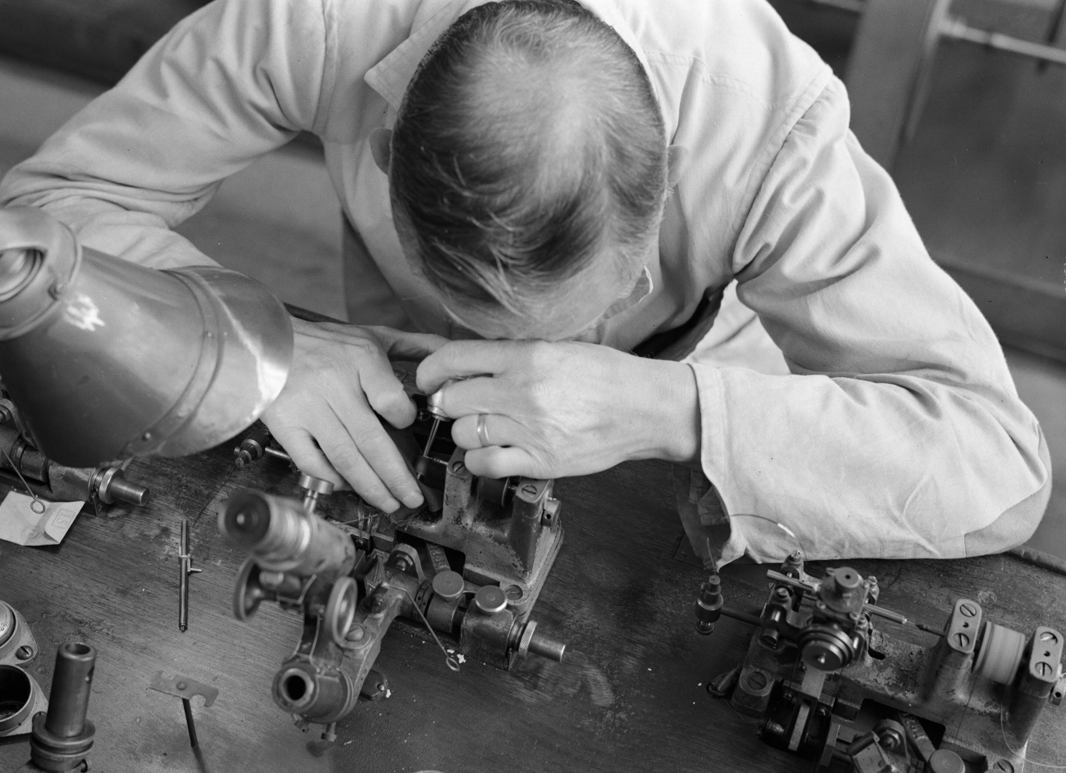 Een medewerker van Philips bezig aan een draaibank